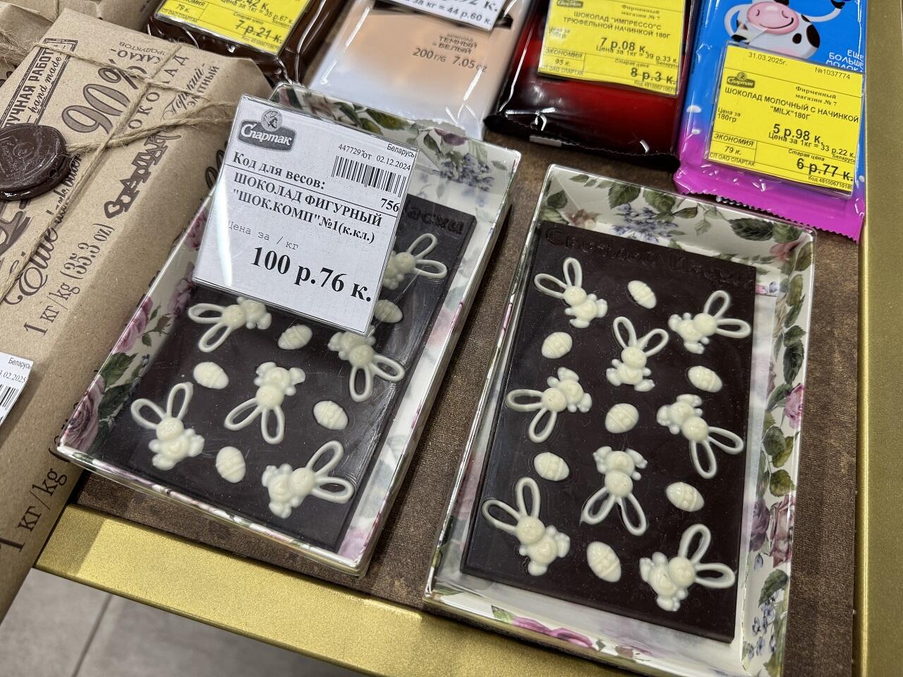Кондитерская фабрика «Спартак» изобразила на шоколаде ручной работы зайчат за 1 кг лакомства – 100,76. Поштучно в торговых сетях представлены шоколадные курицы и цыплята. Есть и сахарные кондитерские изделия в виде животных – 4,35 за зайца или буренку.