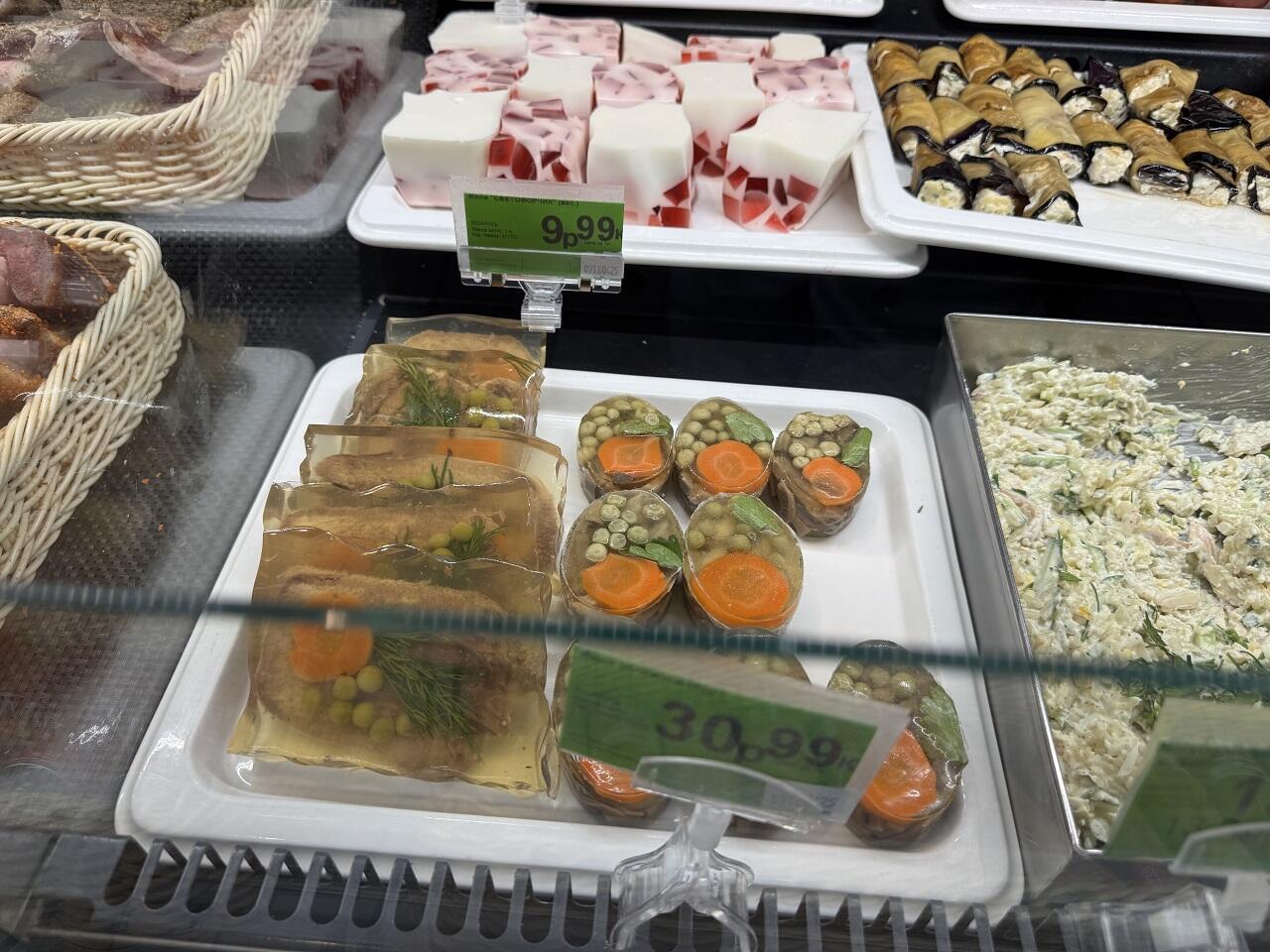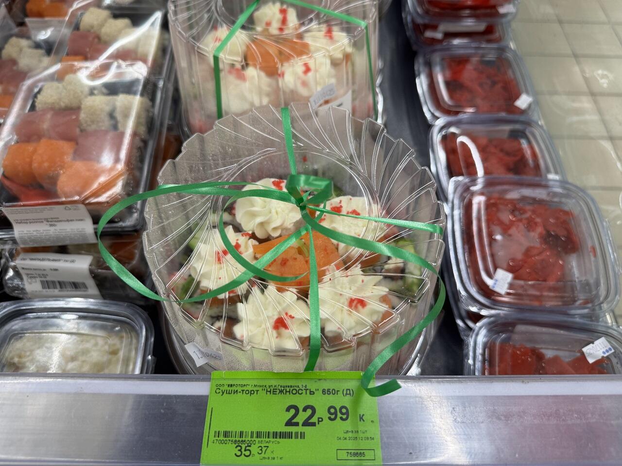 Для равнодушных к сладкой выпечке приготовили суши-торт. «Нежность» весом 650 гр стоит 22,99. Из удивительных находок красочное заливное в форме яйца.