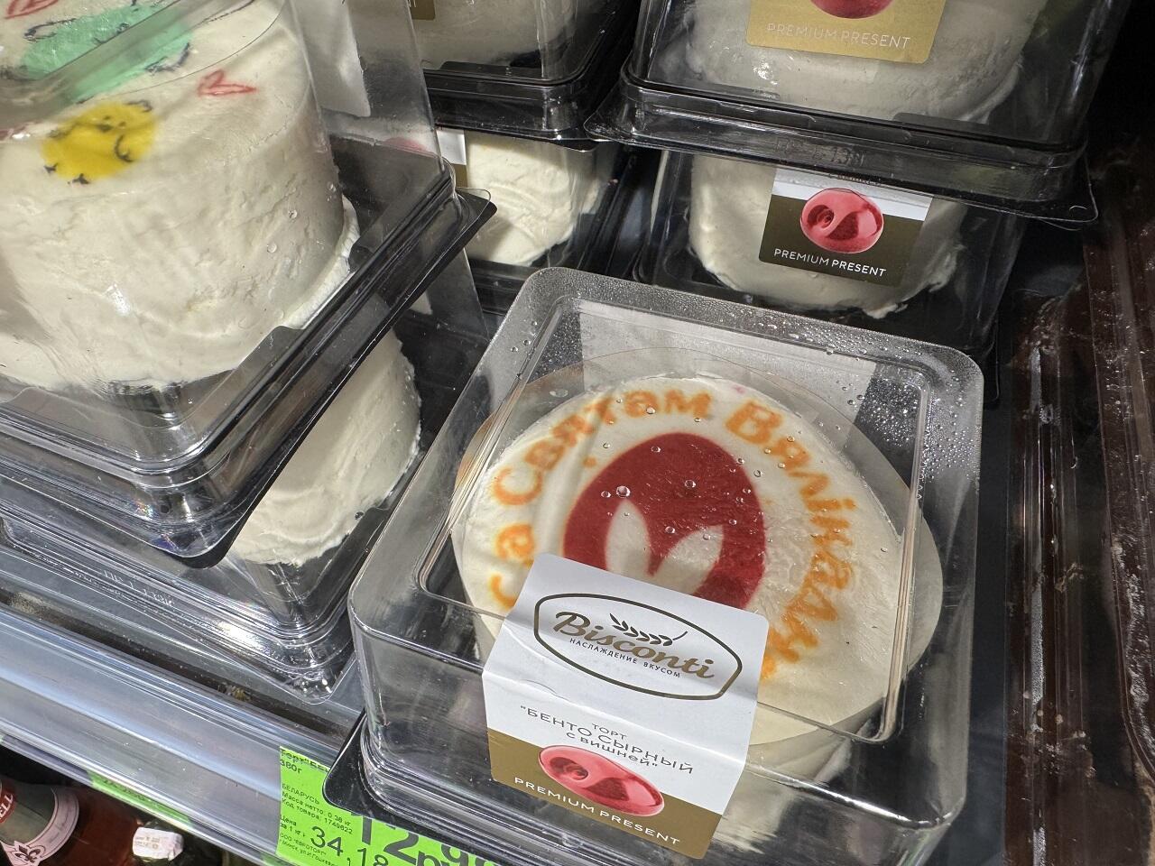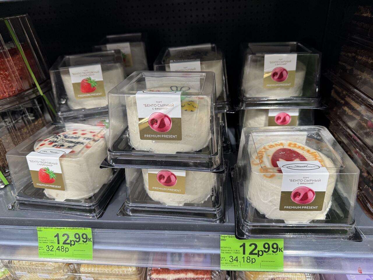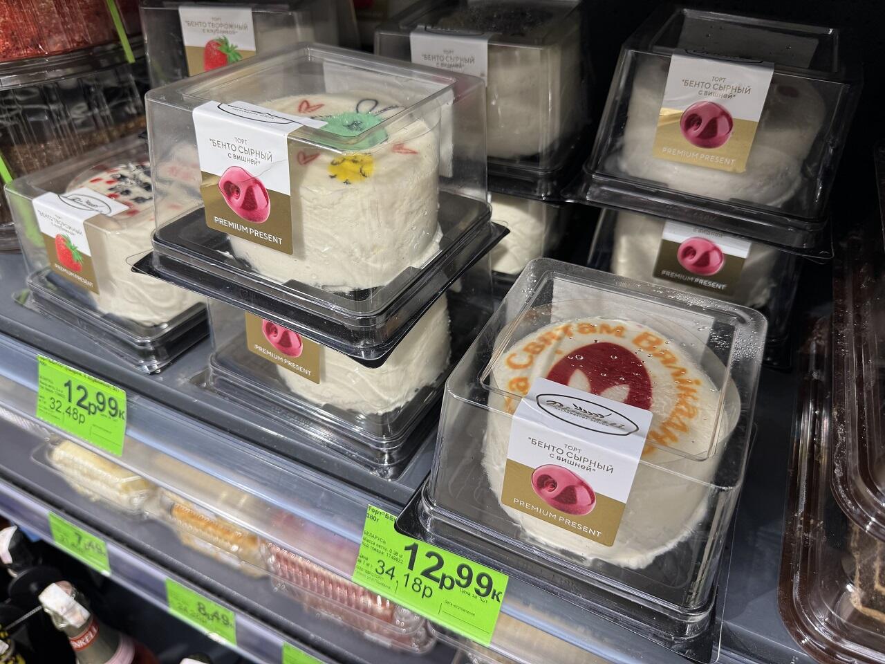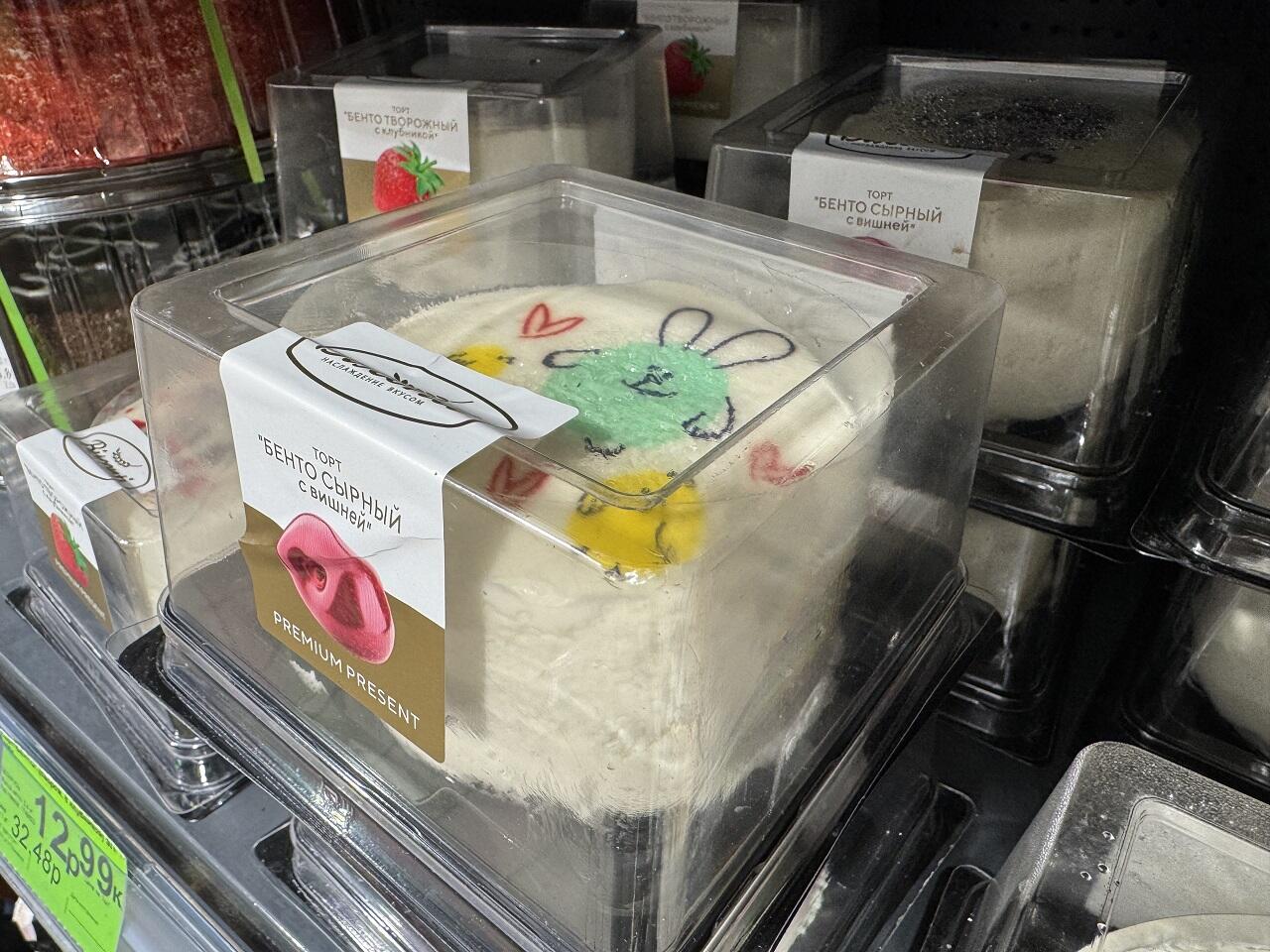Обнаружены творожные бенто тортики весом 400 гр. За 12,99 можно купить десерт с тематическими рисунками и вишневой начинкой.