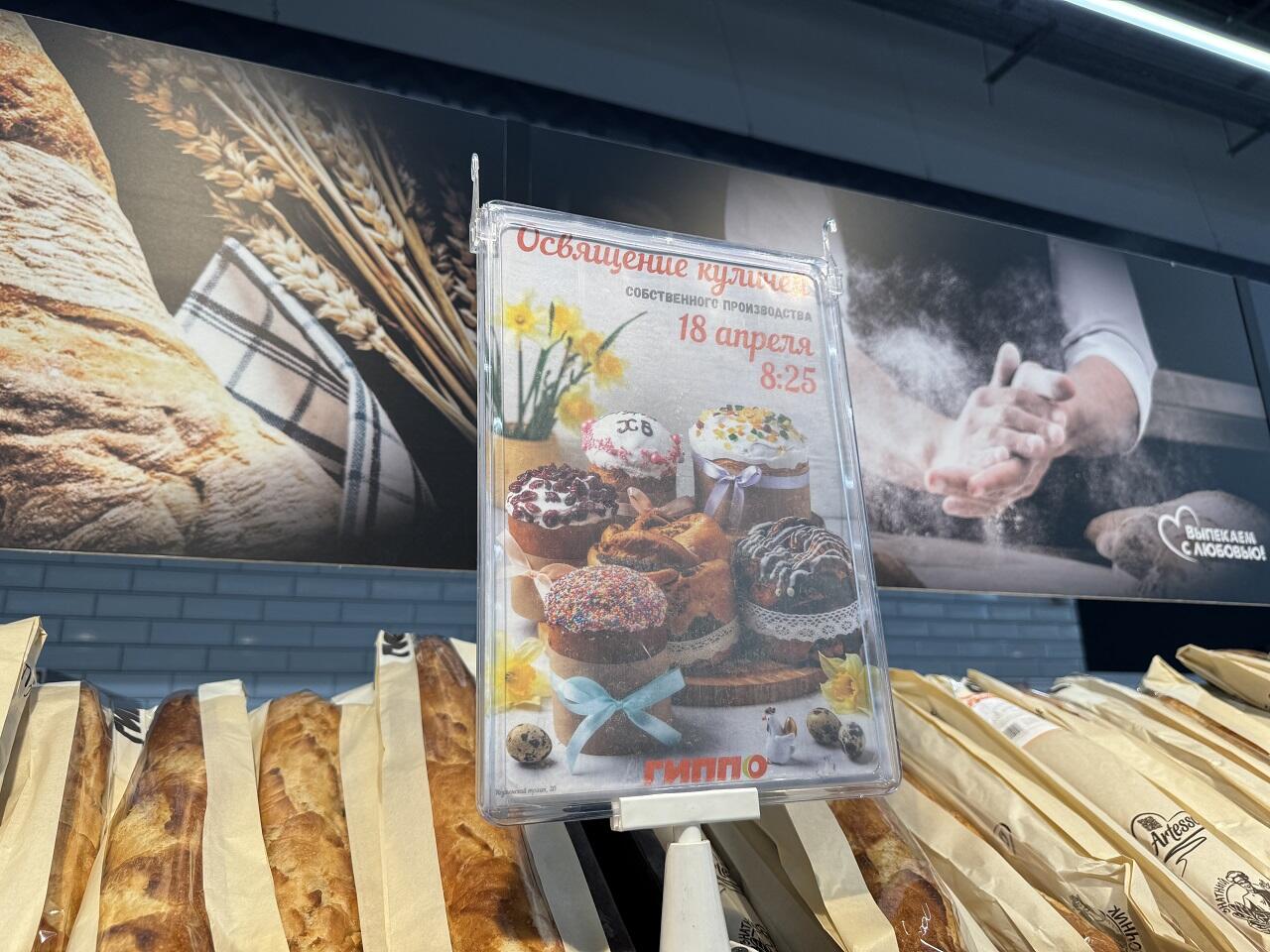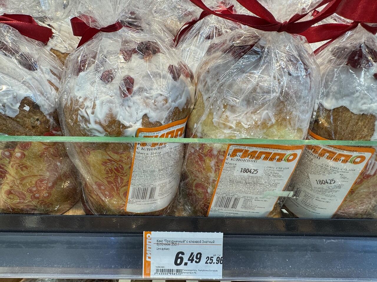 Самая большая концентрация покупателей собралась в отделе с выпечкой. Традиционный кулич с клюквой или цукатами стоит до 10 рублей за штуку. Кекс с творогом и арахисом 400 гр обойдётся в 9,43. Кекс праздничный «Йогуртно-виноградный» 700 гр – 18,99. С клюквой «Знатный» 250 гр – 6,49. Преимущественно выпечка свежая и приготовлена день в день. В Гиппо нашли табличку о том, что сдоба собственного производства ранее была освящена.