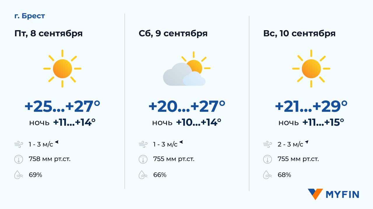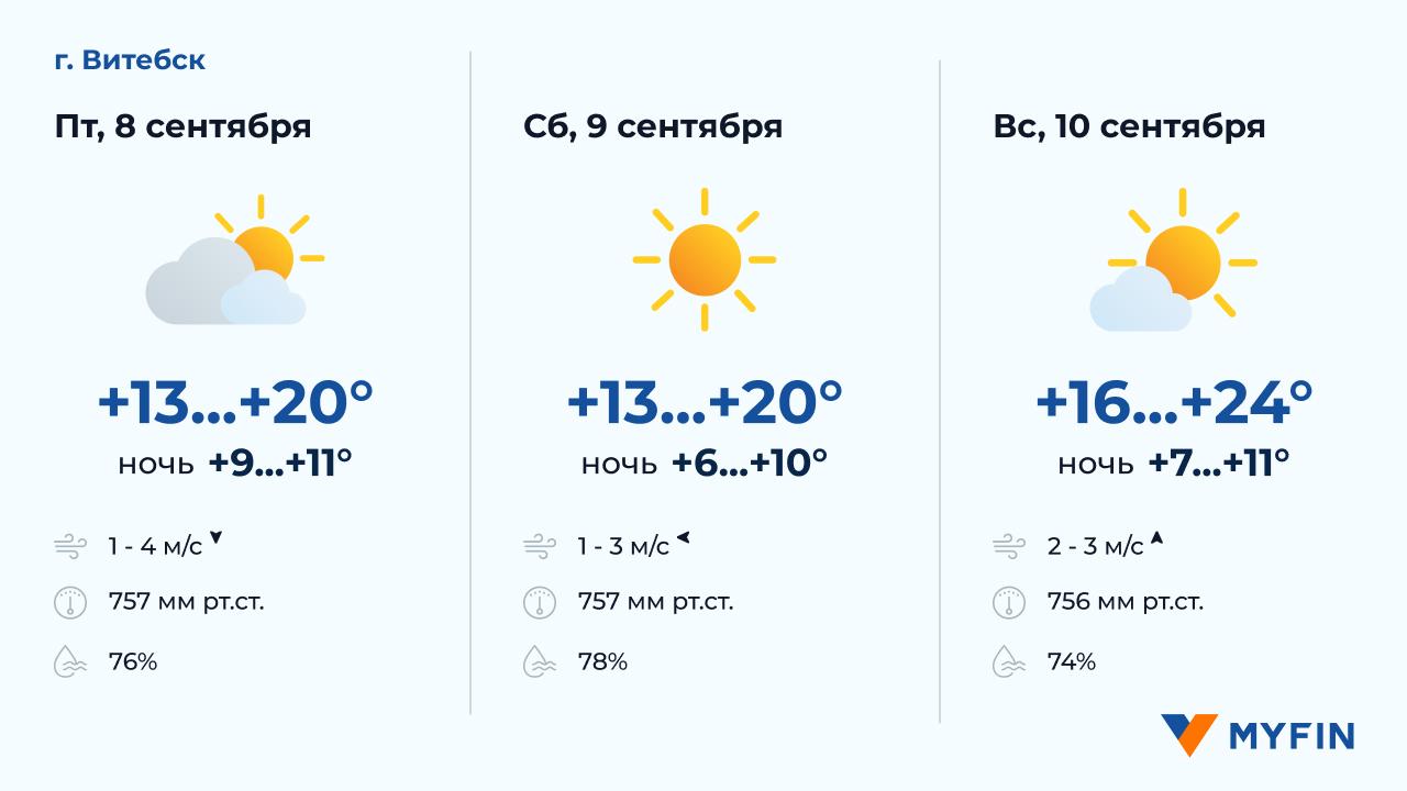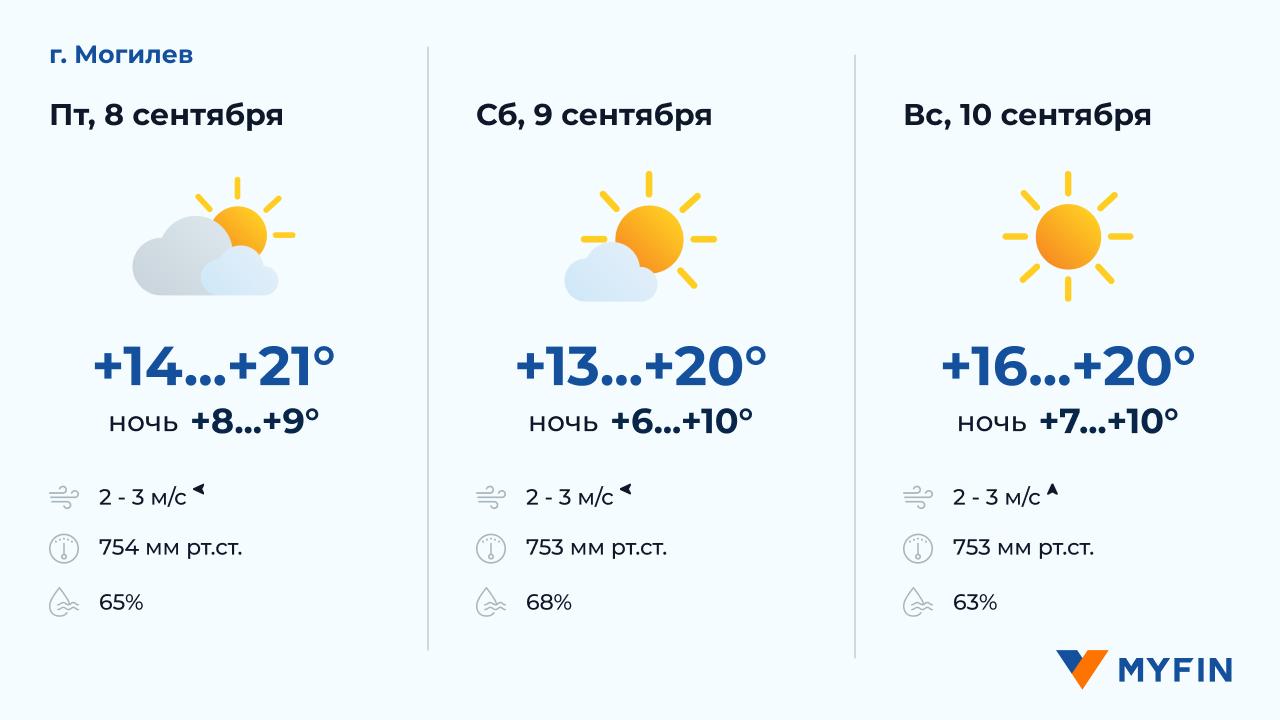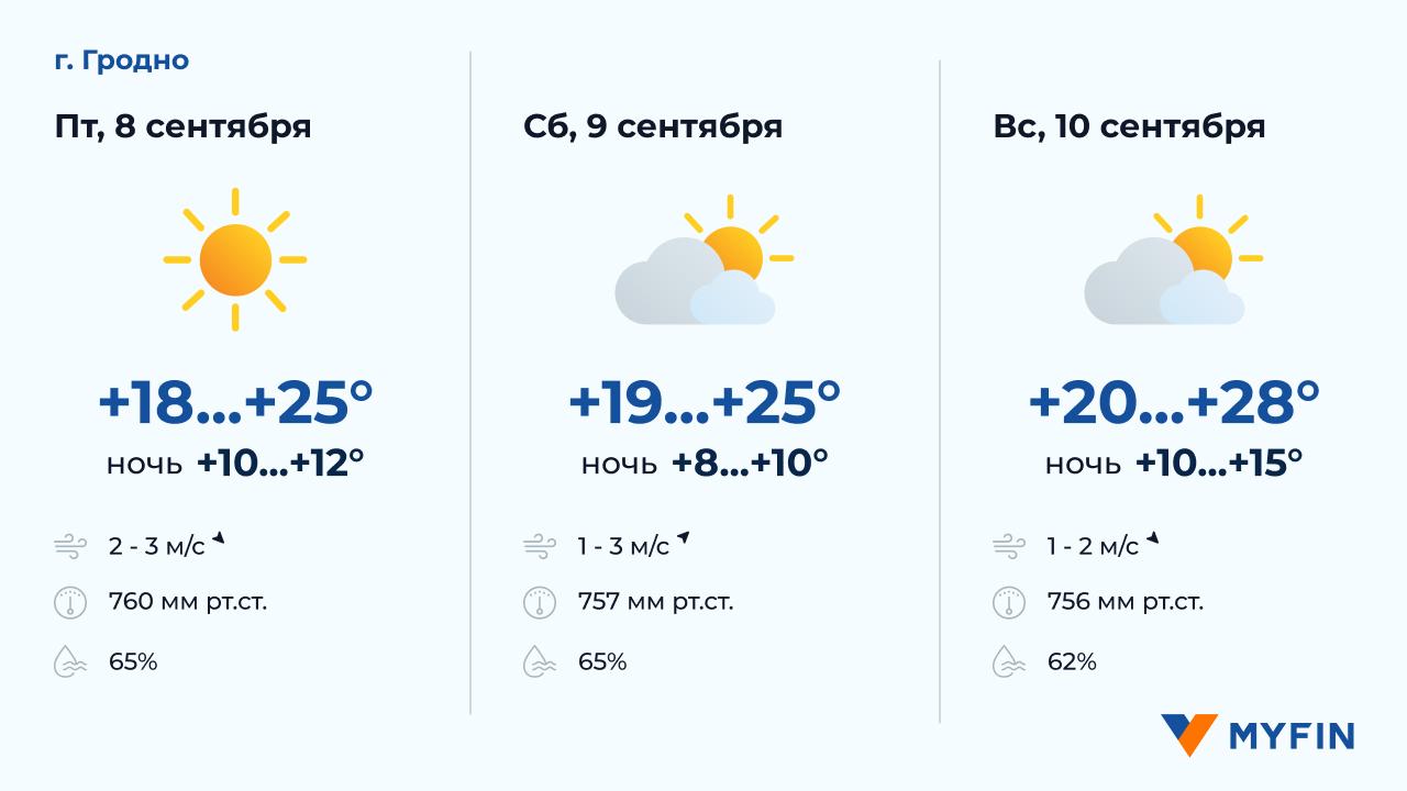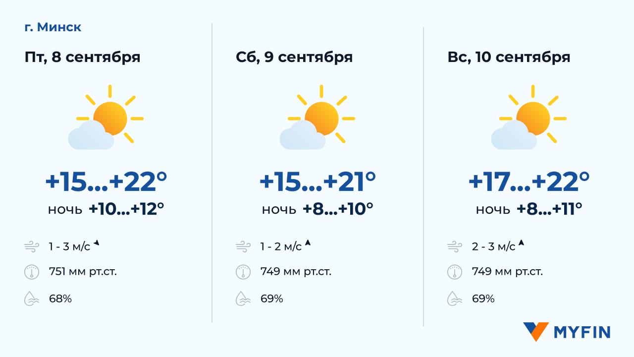 8 сентября, по данным Белгидромета, без осадков. Температура воздуха днем +15..+22°С. Ветер северо-западный, скоростью 1-3 м/c. 9 сентября без осадков. Температура воздуха ночью +8..+10°С, днем +15..+21°С. Ветер южный, скоростью 1-2 м/c. 10 сентября без осадков. Температура воздуха ночью +8..+11°С, днем +17..+22°С. Ветер южный, скоростью 2-3 м/c.