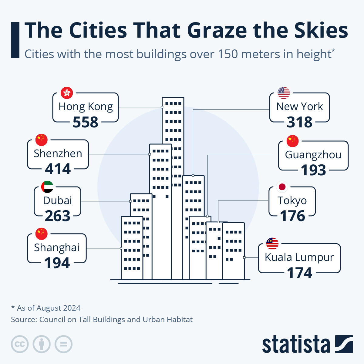 Как сообщает Statista, лидером по количеству зданий высотой более 150 метров является Гонконг. Здесь насчитывается 558 таких сооружений.