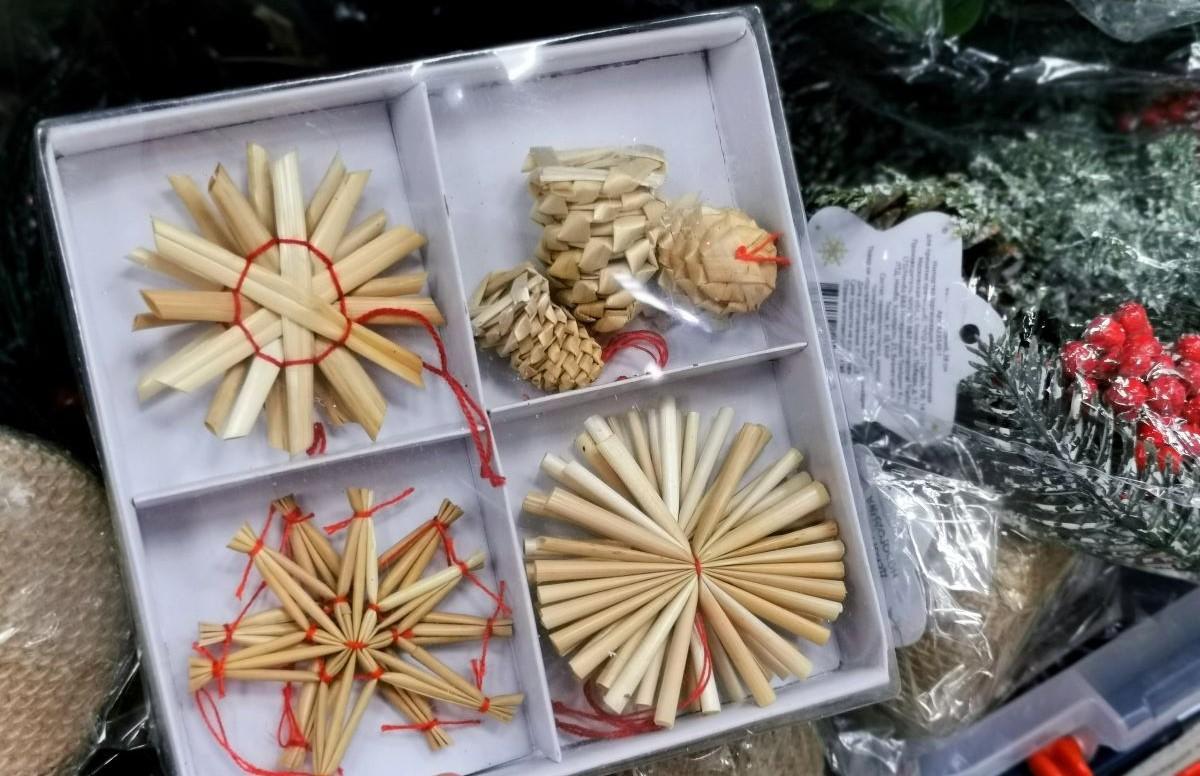 Кроме шаров, здесь куча других украшений. Субъективно: стеклянные фигурки за 7 рублей выглядят не очень привлекательно из-за неаккуратного исполнения. А вот деревянные и мягкие украшения – выше всяких похвал, в том числе и из-за цен. Всего 1,5 рубля стоит набор из 12 красных бантов на елку, такая же цена у деревянных саней. Подороже – 4 рубля! – продают деревянную карусель с мелкими деталями. Остальные игрушки в том же ценовом диапазоне: подвесная композиция – 2,8 рубля, деревянное сердце или олень в красные снежинки – 3 рубля, столько же – подвесные украшения из соломки. Елочный шпиль продается уже за 4,6 рубля – мы уже говорили, что дешевле 1,8 рубля не найдете!