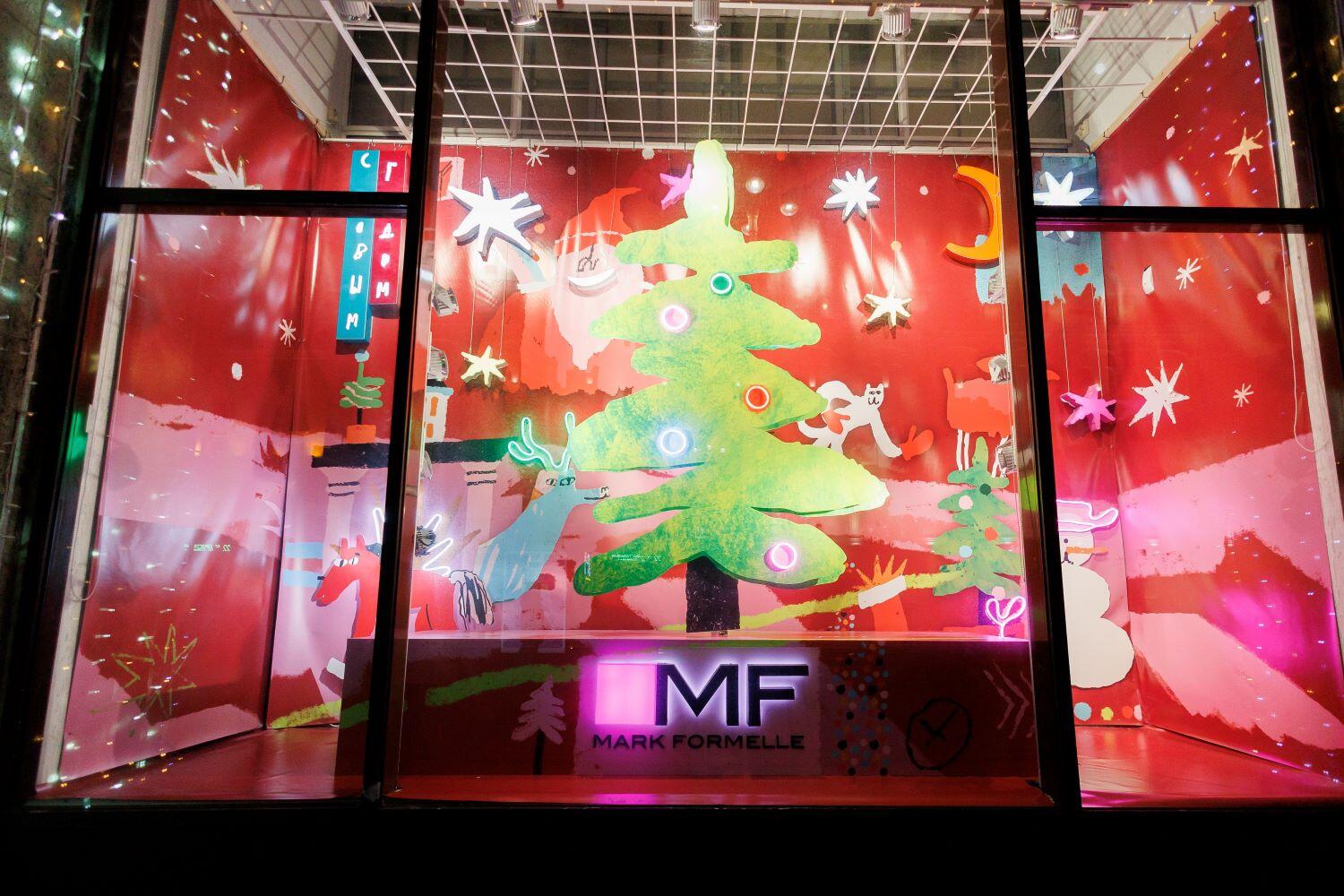 Как рассказали MYFIN в компании Mark Formelle, в основу оформления их витрины легла иллюстрация, созданная известным художником-примитивистом Ильей Кутобоем специально для модного бренда. В витрине можно увидеть новогодний пейзаж и персонажей – Деда Мороза, елку и лошадь – символ 2026 года. Ключевая идея работы – в погружении в мир ярких красок, теплых оттенков и смелых форм.