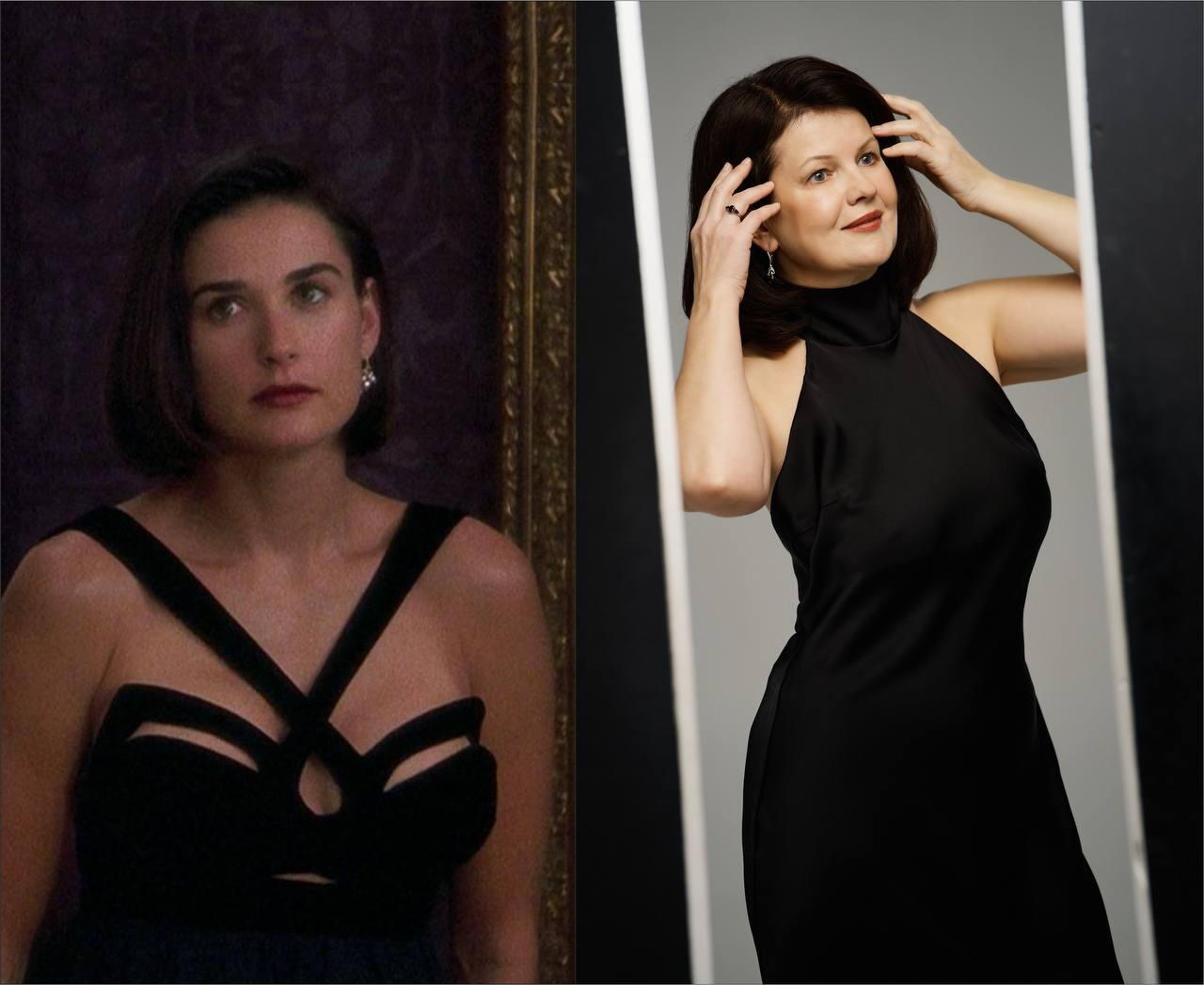 Стилист выбрала для нее черное атласное платье в пол – похожее на то, что было у героини Деми Мур. Его минимализм подчеркнул природные контрасты: темные волосы «каре», фарфоровую кожу и голубые глаза. Макияж выдержан в духе «тихой роскоши» с акцентом на губы, чтобы сохранить баланс между строгостью и яркостью.