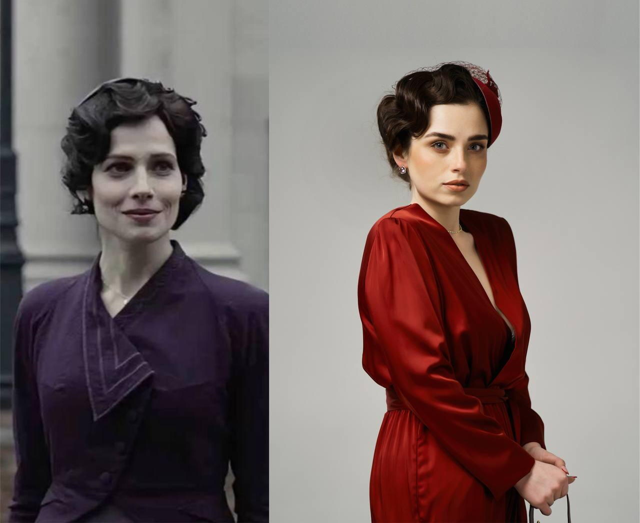 Стилист подобрала для девушки белое классическое платье длиной чуть выше колена – не такое откровенное, как в фильме. Убранные назад волосы и нюдовый макияж с лёгкой стрелкой усилили сходство с киногероиней. Холодная приглушённая цветовая гамма подчеркнула аристократические черты лица.