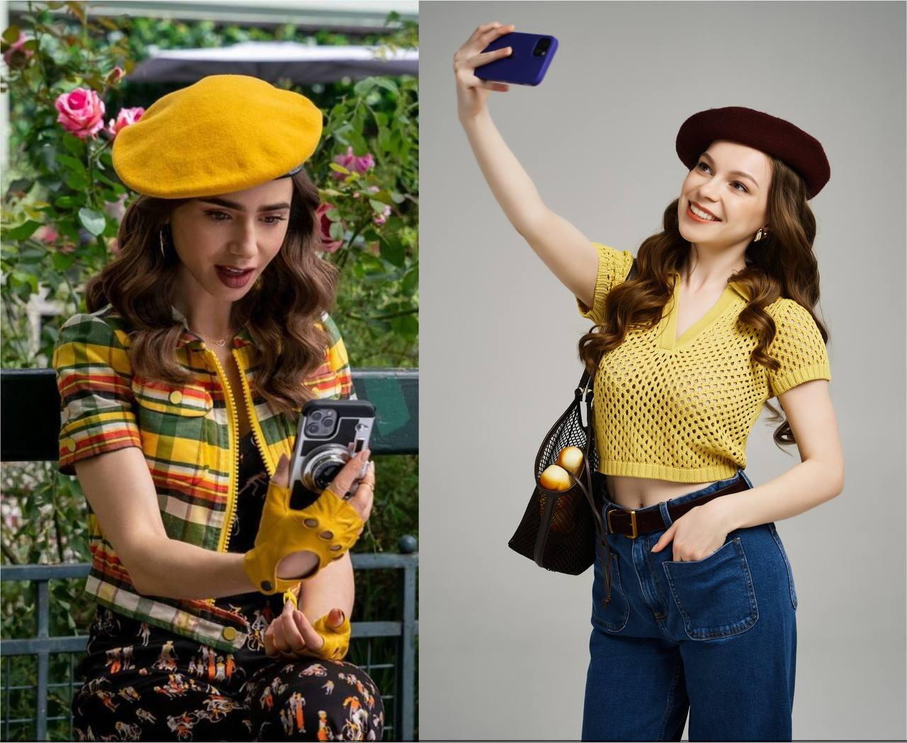 Для девушки был создан яркий образ в стиле сериала. Горчичный вязаный топ, синие расклешенные джинсы и бордовый берет – получилась идеальная формула «легкого парижского шика». Оттенки подобраны под «теплый» цветотип Марии, а мягкие волны в волосах добавили образу кинематографичности. В качестве макияж – нюдовые оттенки, чтобы не перегружать яркий лук.