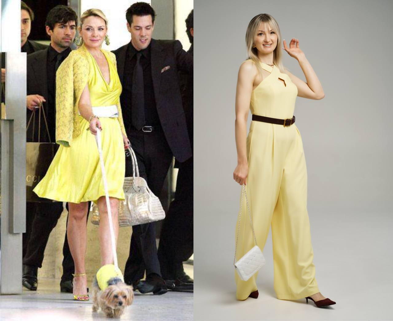 Для образа выбран лимонно-жёлтый брючный комбинезон «палаццо». Это дерзко, но изящно – как раз в духе Саманты. Сочетание делового стиля с чувственной женственностью получилось смелым, но не вульгарным. Дневной макияж в бежевых тонах сбалансировал яркий образ.