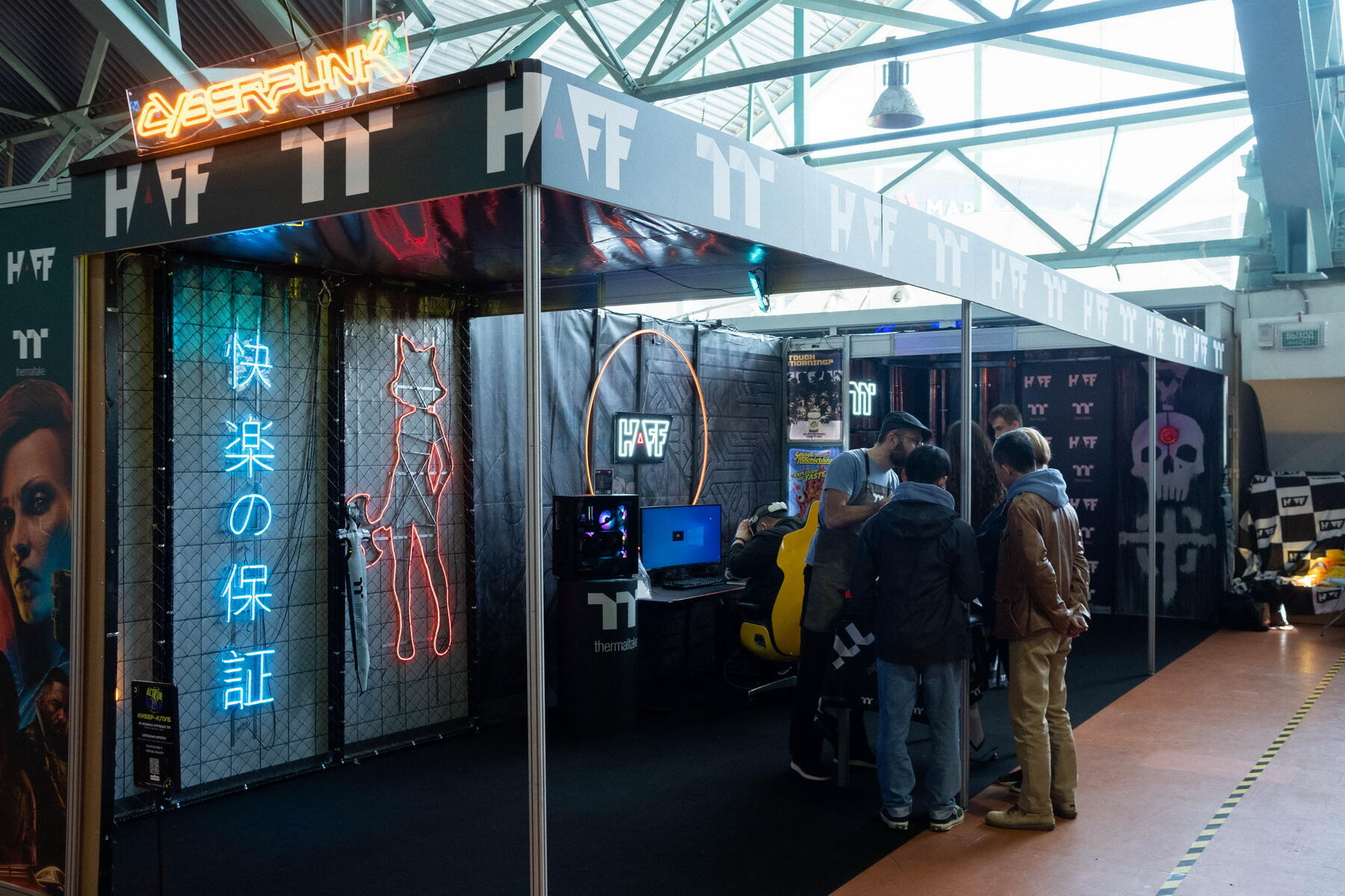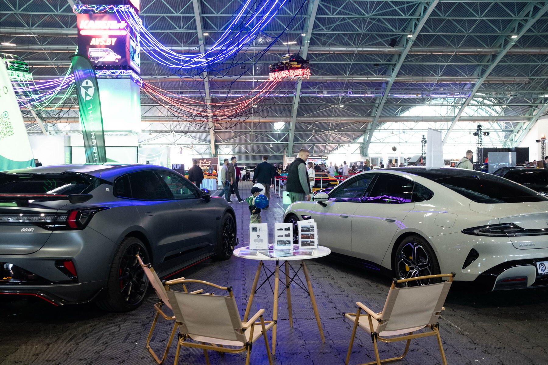В самом центре автовыставки было оборудовано масштабное киберпространство. Каждый элемент футуристичного дизайна был продуман до мелочей: три гигантских кубических экрана, четыре подвешенных под потолком автомобиля, десятки неоновых кабелей, которые вели к зоне развлечений и релакса. Неудивительно, что пространство стало местом притяжения на ивенте.