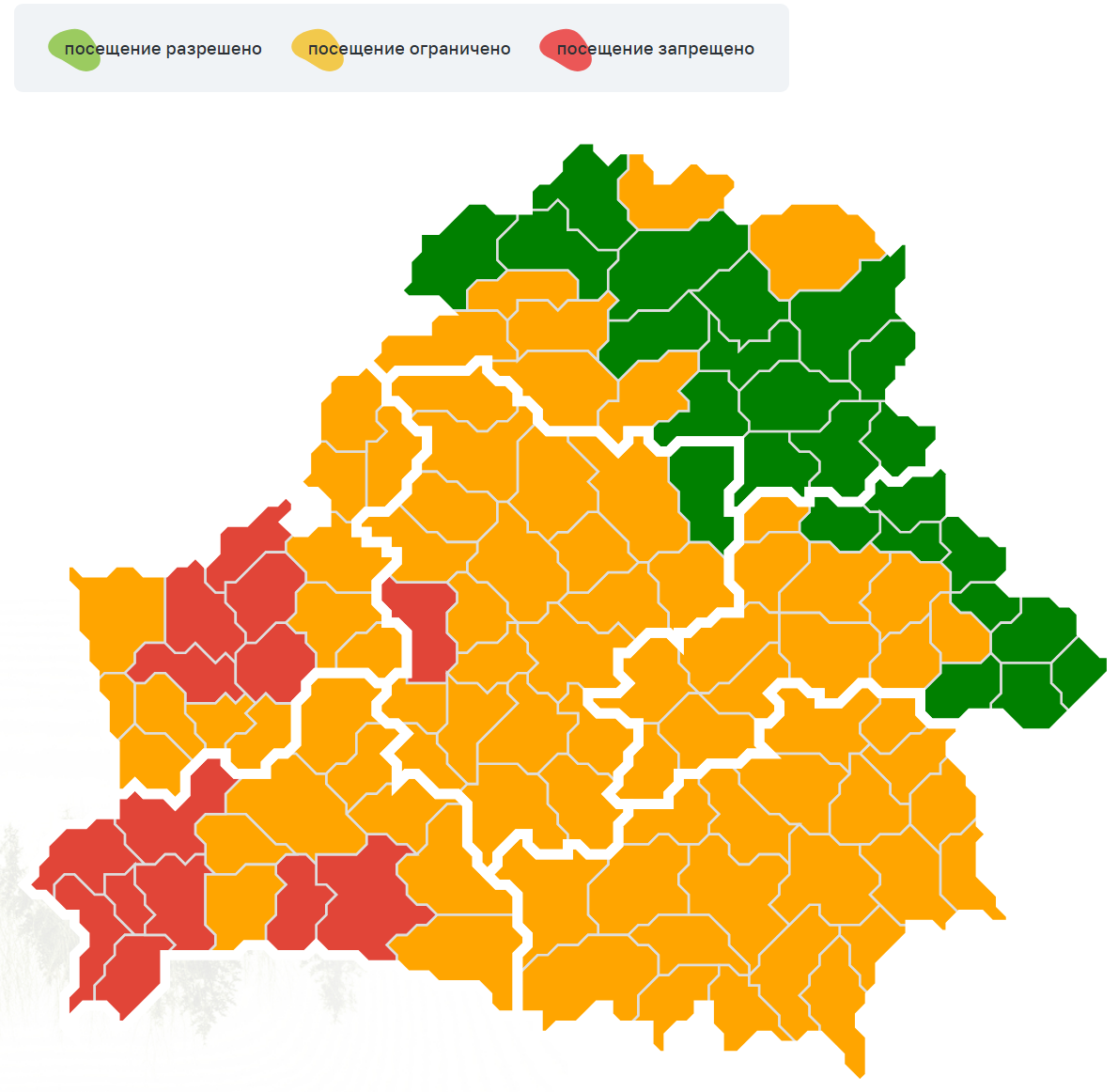 Ограничения на посещение лесных массивов действуют в 13 районах Гродненской, 8 районах Брестской, 21 районе Гомельской, 17 районах Минской, 12 районах Могилевской и 5 районах Витебской области. Это означает, что в лес можно заходить для прогулок, однако въезжать на его территорию на автомобиле, а также разводить костры там запрещено.