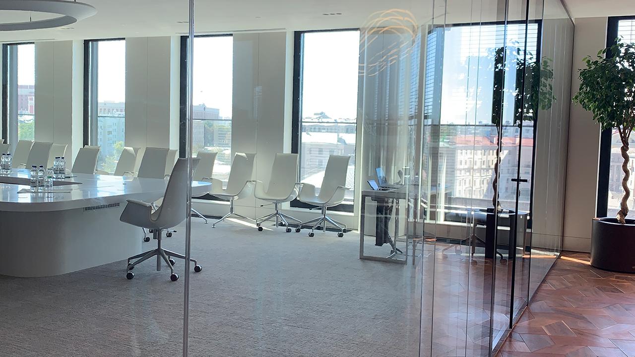 Сейчас все этажи, кроме девятого, напоминают open space: 2 кухни на этаж, раздевалки, туалеты, комната отдыха, несколько переговорных и парочка тренажеров в коридорах. На 9-м этаже по периметру располагаются кабинеты руководства. Примечательно, что все офисы топ-менеджмента стеклянные.