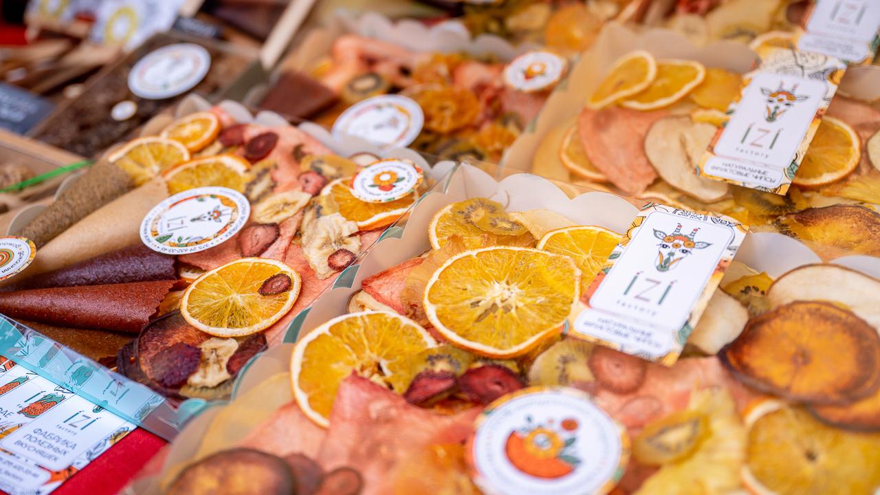 Например, рядом с Татьяной, у которой можно купить чипсы из мяса, располагается точка бренда IZI-FACTORY с фруктовыми чипсами, пастилой, добавками в кашу, мандариновыми дольками и многим другим. Фабрику полезных вкусняшек представляет Инга. Проекту около двух лет. Идея пришла во время путешествия по Южной Африке. Там из-за большой жары местные придумали сушить фрукты и употреблять их в таком виде как полезные сладости.