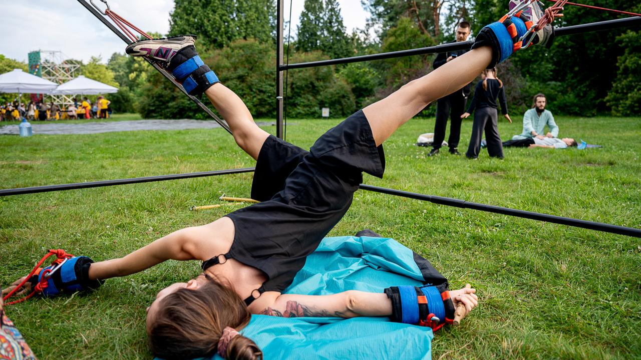 Чуть вырвались из вкусной площадки Local Food Market на главную аллею и сразу приметили на полянке среди природы площадку Perekrestok Zdrav. Сюда пришли белорусы, которые интересуются оздоровительными и ментальными практиками: йогой, массажем, гвоздестоянием, древней энергетической гимнастикой цигун и так далее. Здесь своя атмосфера: люди сидят в кругу, учатся глубоко дышать и расслабляться. Они как будто путешествуют внутри себя, не обращая внимания на шум и музыку вокруг.