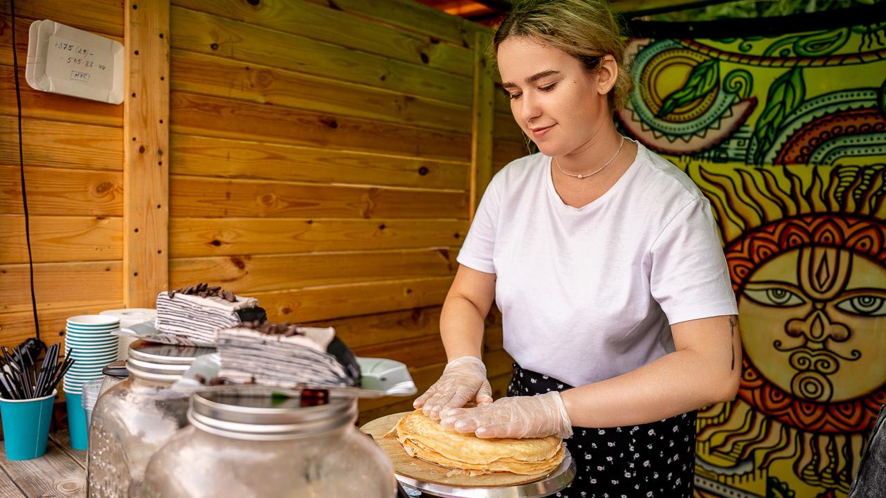 Пока Евгений гулял по фестивалю, мы разузнали у девушек его историю. Молодой человек очень любит готовить. Сначала он открыл свой небольшой кейтеринг, а потом задумался о том, чтобы создать собственный самобытный продукт, которому белорусы удивятся, но в итоге полюбят. Идею блинных тортиков перенял из Китая. Добавил в рецептуру белорусский колорит, и людям «зашло».