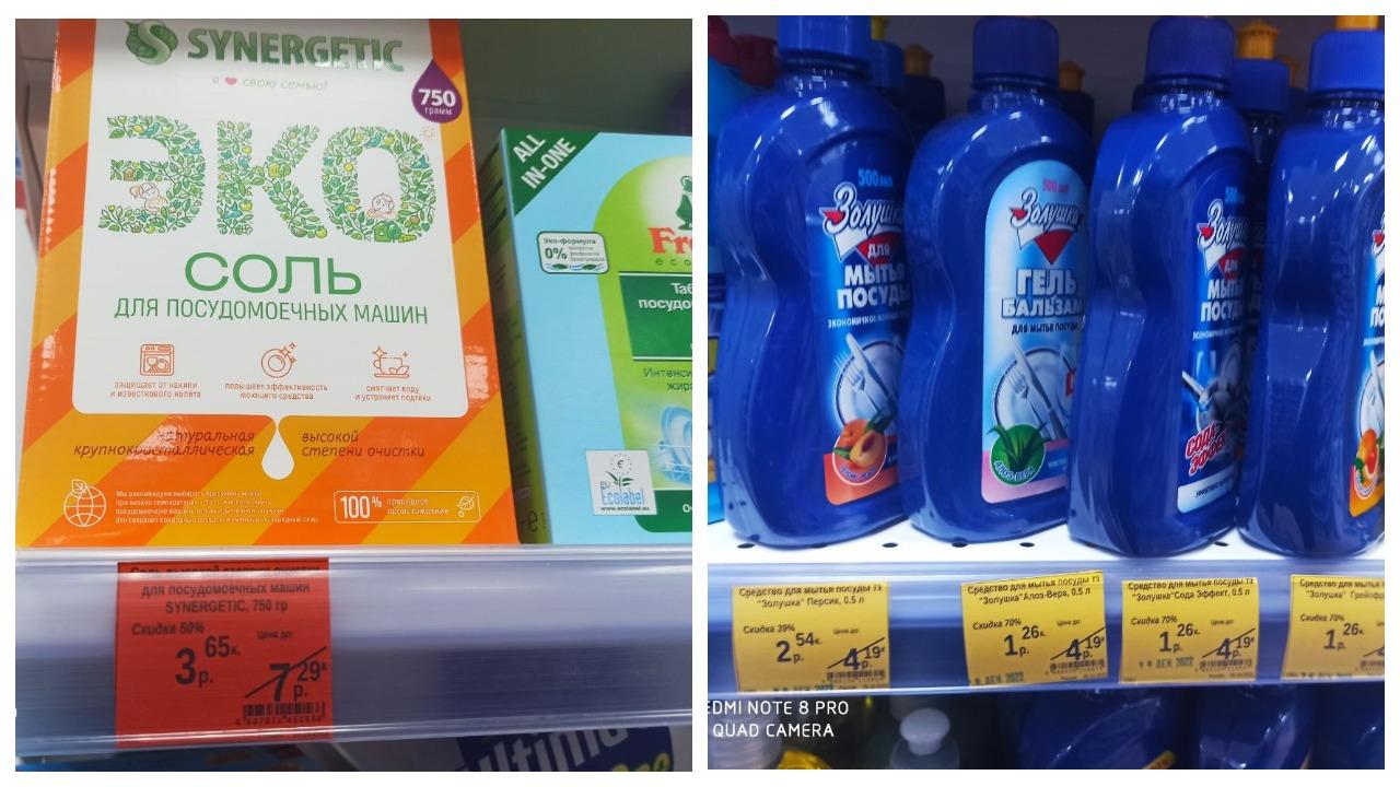Если хорошо поискать, можно найти отличные дисконты на бытовую химию и товары для дома, например, средство для мытья посуды за 2,54 вместо 4,19 рубля, соль для посудомоечных машин за 3,65 вместо 7,29 рубля и пакеты для мусора за 2,50 вместо 4,09 рубля.