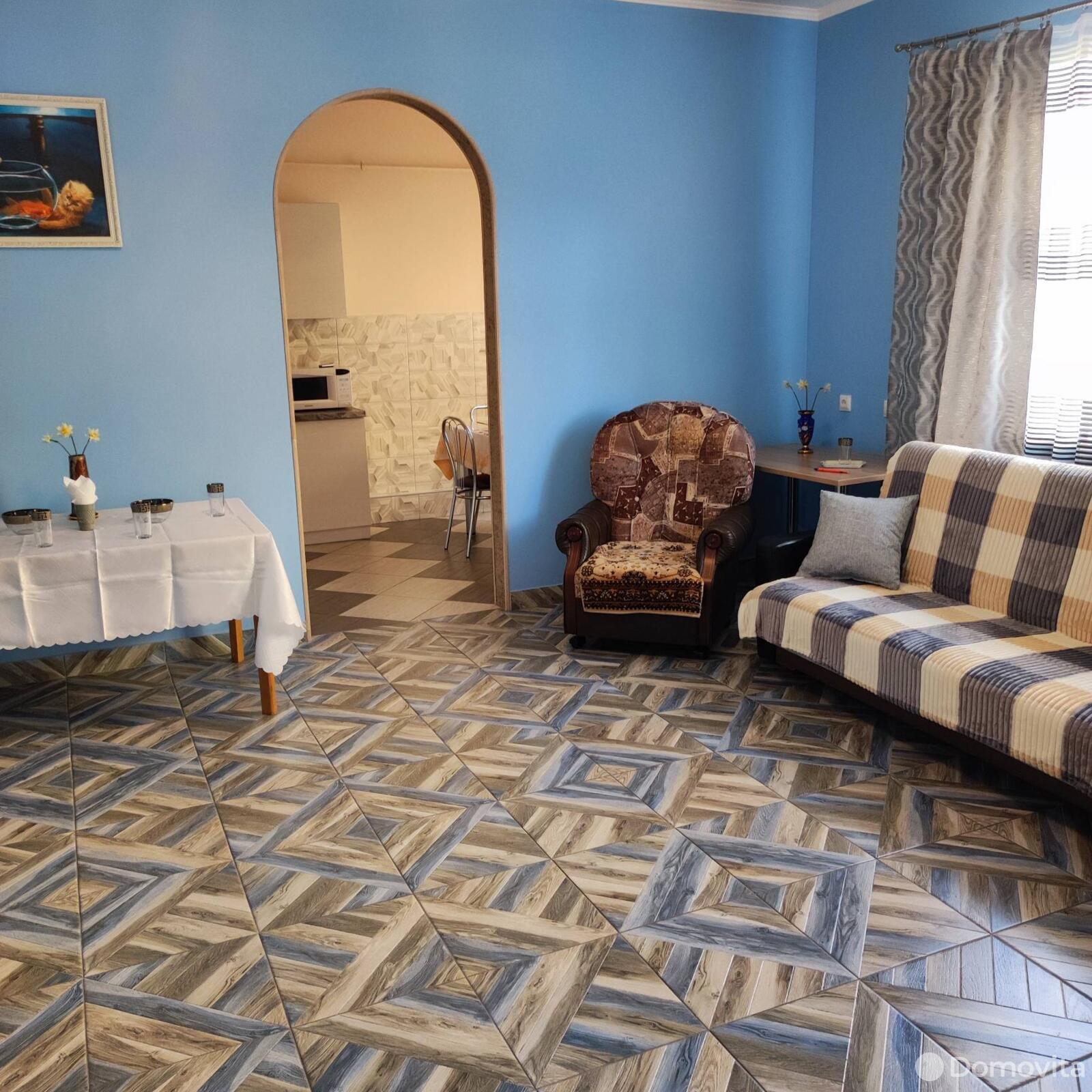 Следующий коттедж находится практически в Минске — всего в 700 м от МКАД. Площадь одноэтажного коттеджа — 115 кв. м. В доме две комнаты (5 спальных мест), а также банкетный зал, в котором можно отпраздновать важное событие. Из гостиной гости могут выйти на просторную крытую террасу, которая оборудована садовой мебелью и мангалом.