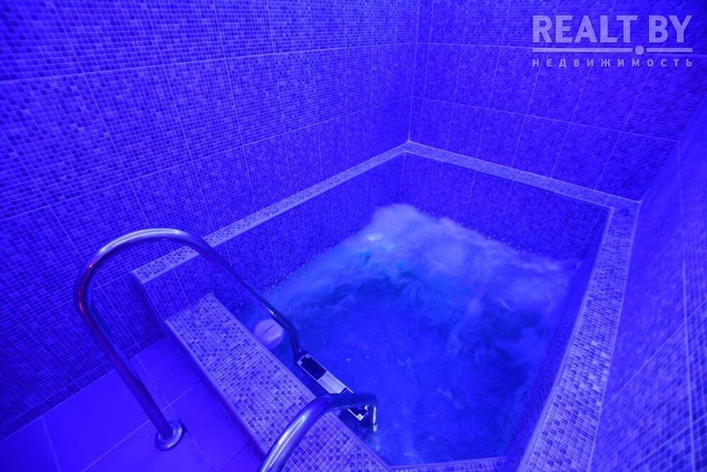 Отдельно стоит отметить баню, бассейн и джакузи — полный релакс гарантирован. На территории коттеджа есть зона для шашлыков с беседкой. Находится дом в живописном месте рядом с лесом и водоемом, поэтому можно проводить время на свежем воздухе.