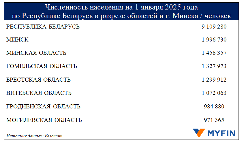 По данным Белстата, на 1 января 2025 года население Беларуси составляло 9 109 280 человек.