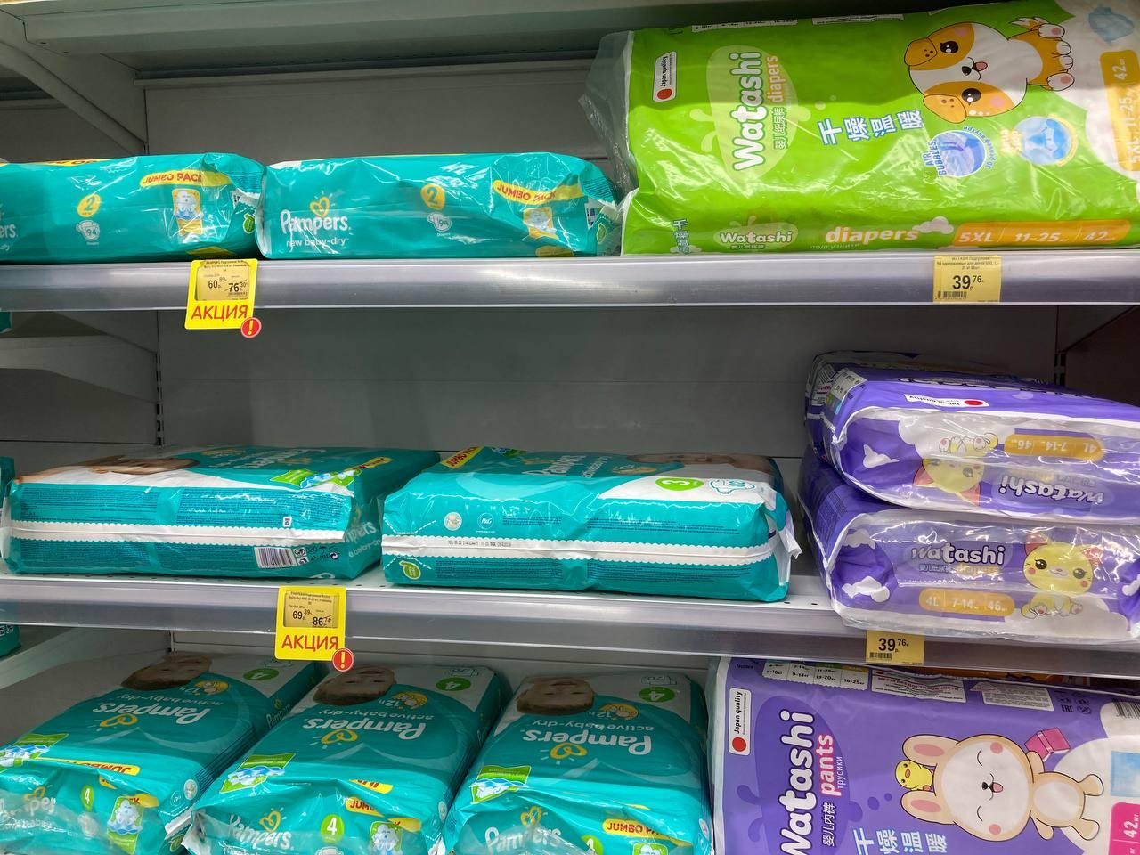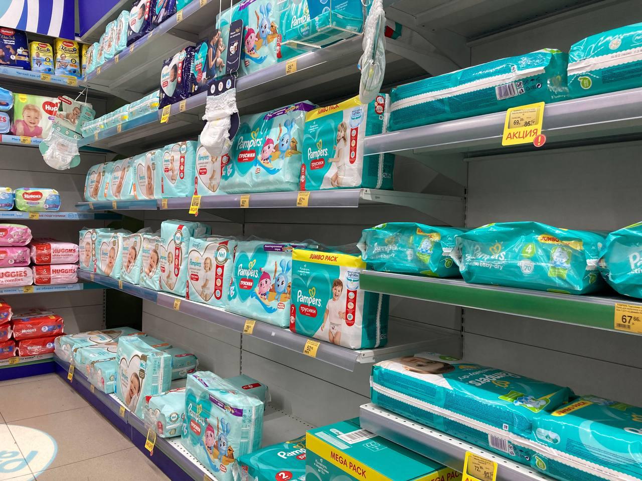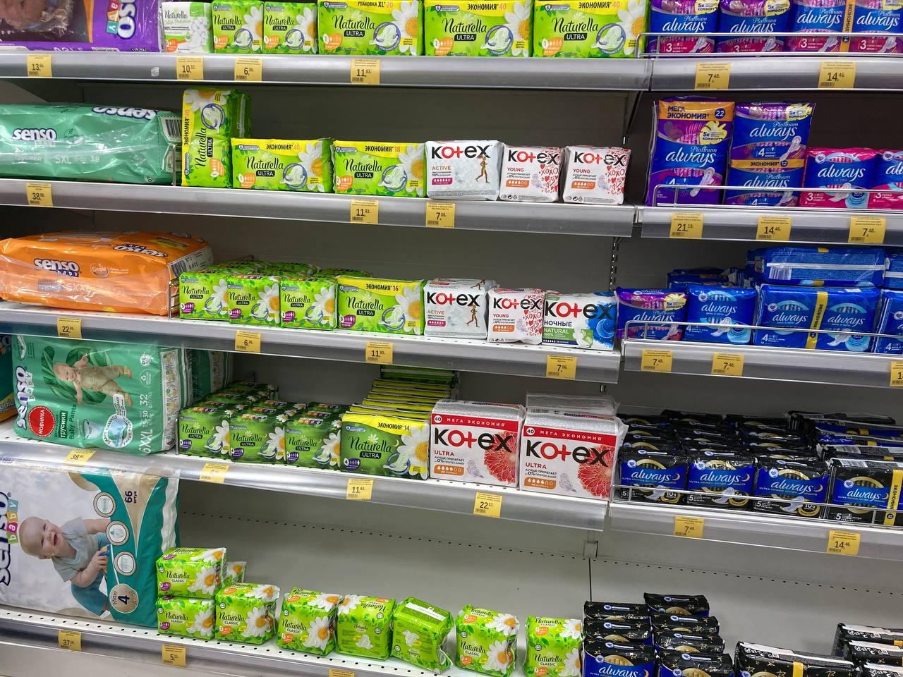 Детских подгузников в магазине немного: упаковки лежат в один ряд, где-то уже закончились. Средства женской гигиены в приличном количестве, правда, белорусских «Мегги» мы там не увидели.