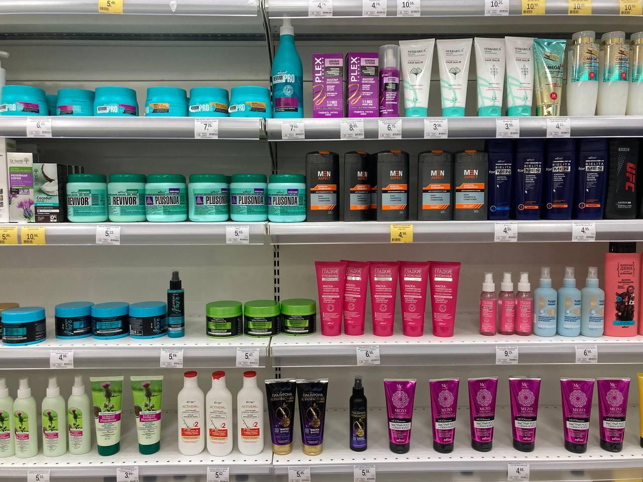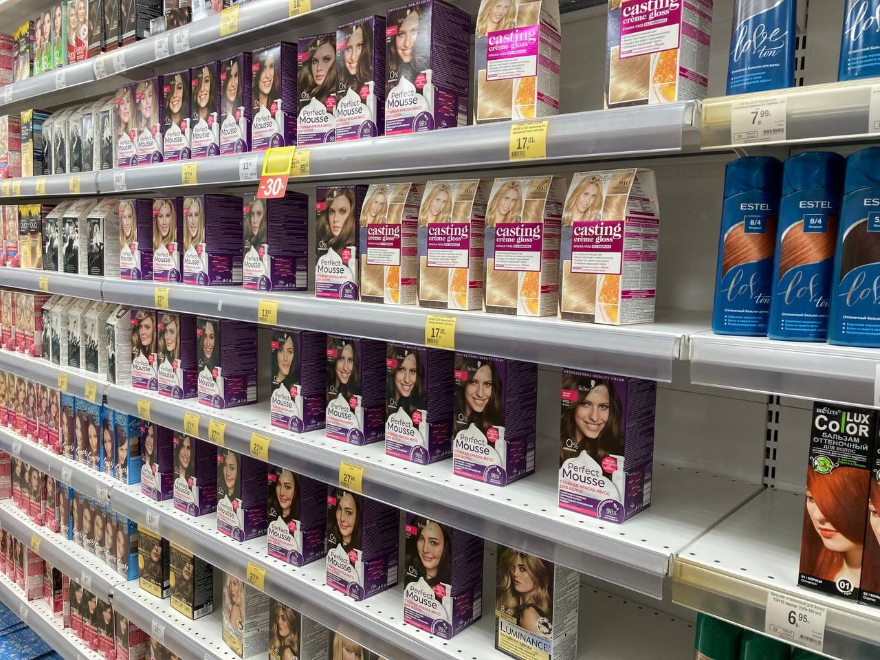 В «Острове чистоты» в ТЦ Dana Mall в глаза бросаются полупустые стеллажи с краской для волос. Остатки (в основном российского и белорусского производства) распределены пунктирно, чтобы совсем уж не зияли дыры.