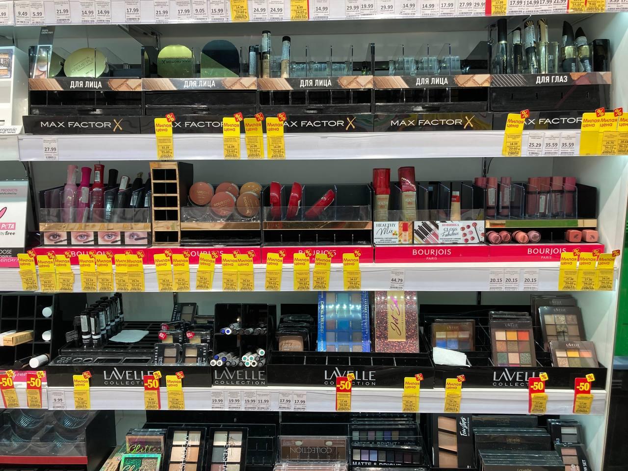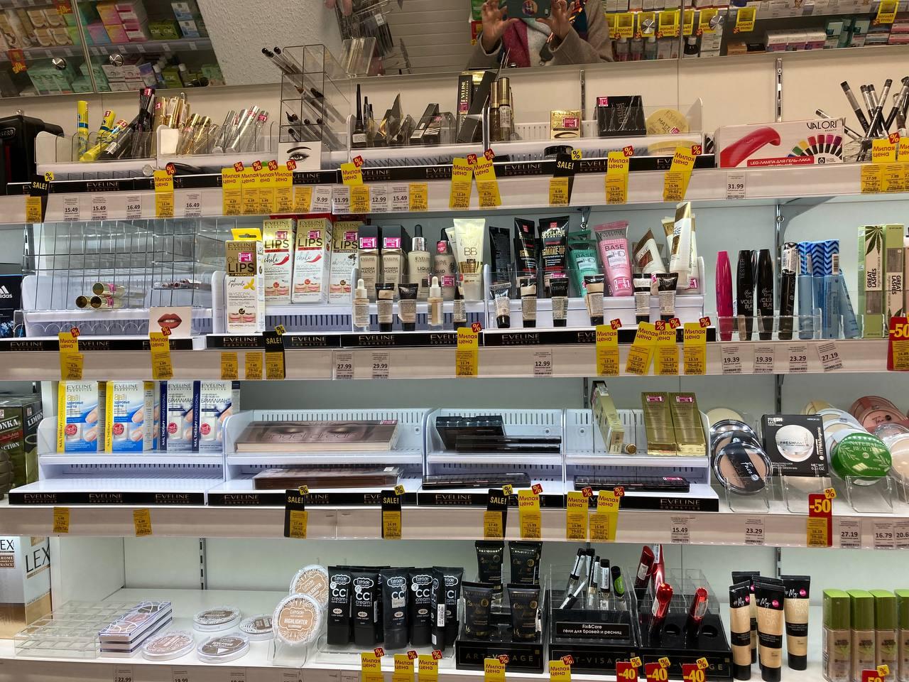 На полках с декоративной косметикой тоже негусто. Стенд польского бренда Eveline Cosmetics занят рандомным парфюмом, зарубежные средства – в остатках. Впрочем, белорусская «декоративка» на месте.