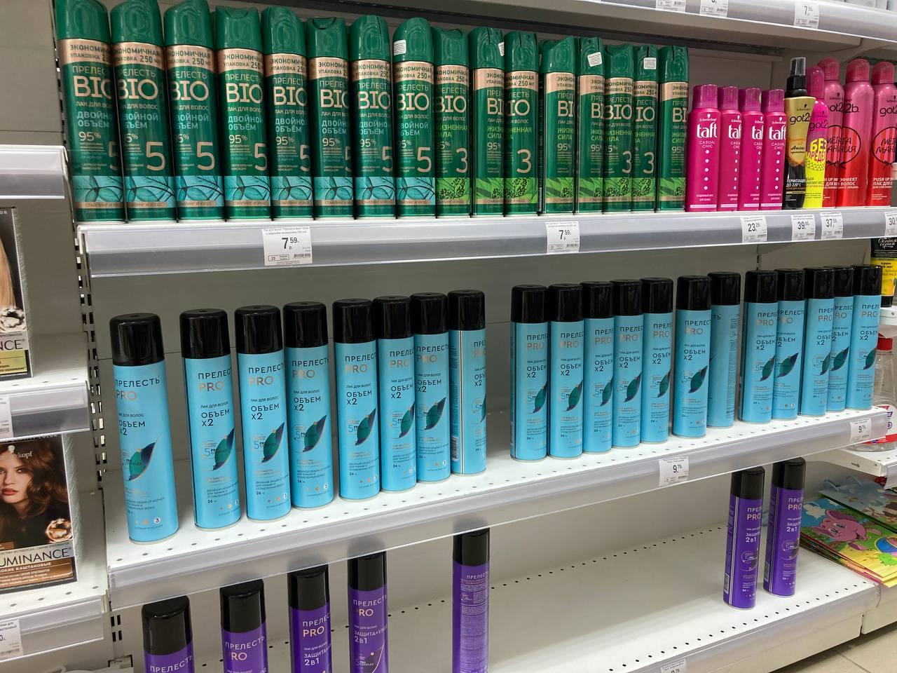 Для сравнения заехали в «Остров чистоты» в другом районе – Юго-Западе. Там на полках еще грустнее и просторнее. Белорусских шампуней и уходовой косметики – считаные баночки, на полках с лаками для волос – одна «Прелесть», и то через раз.
