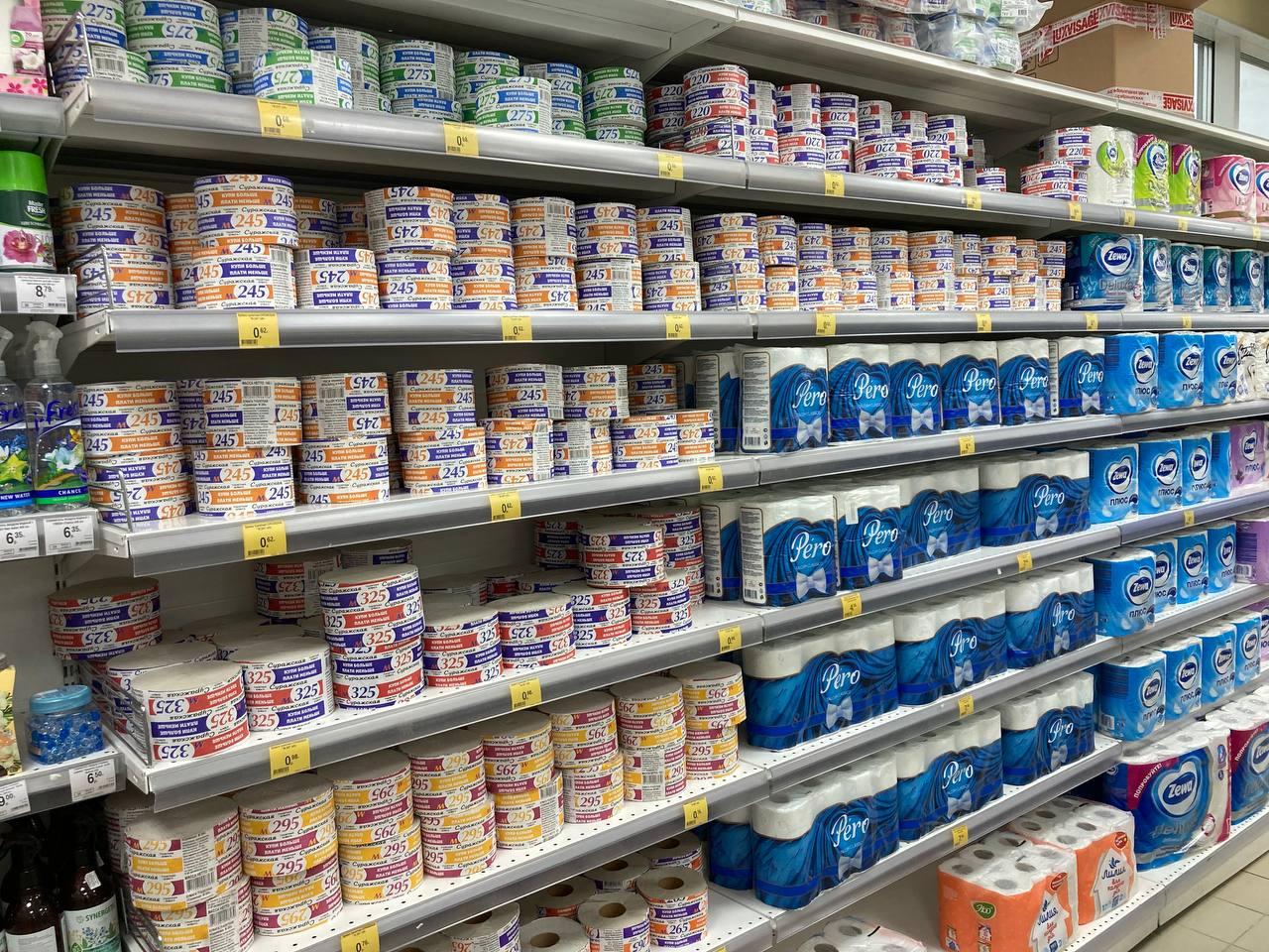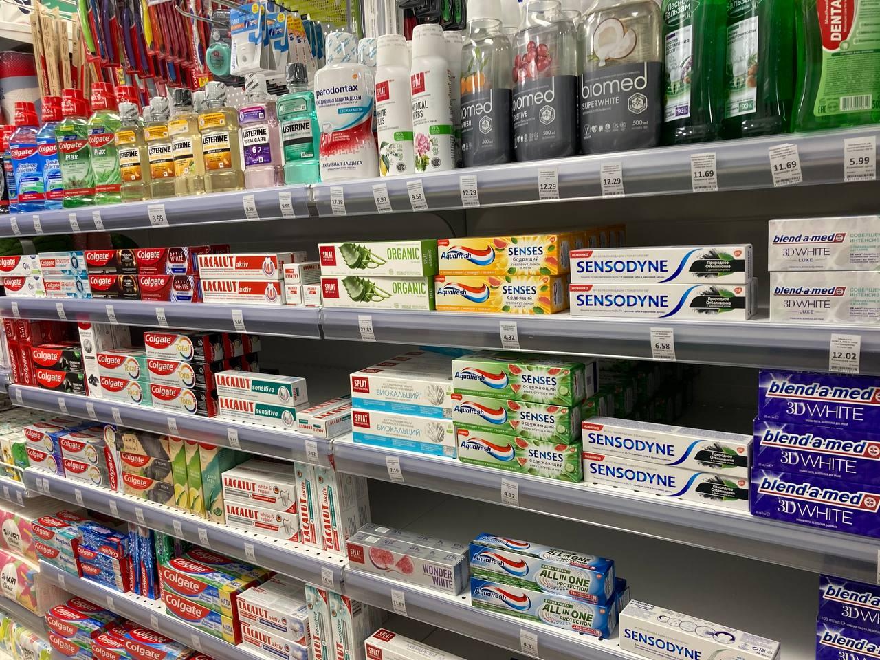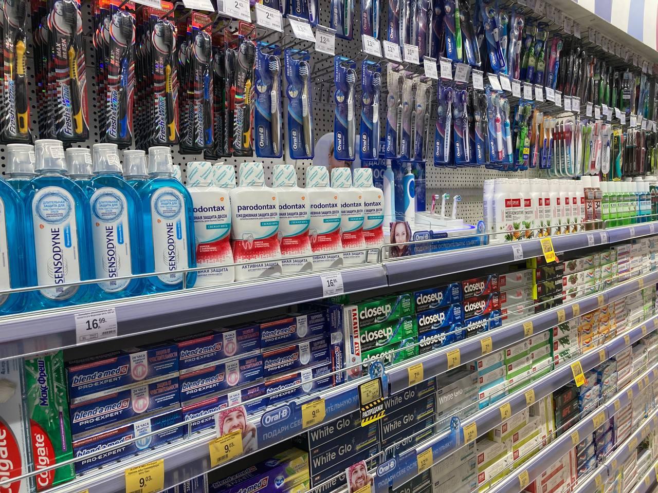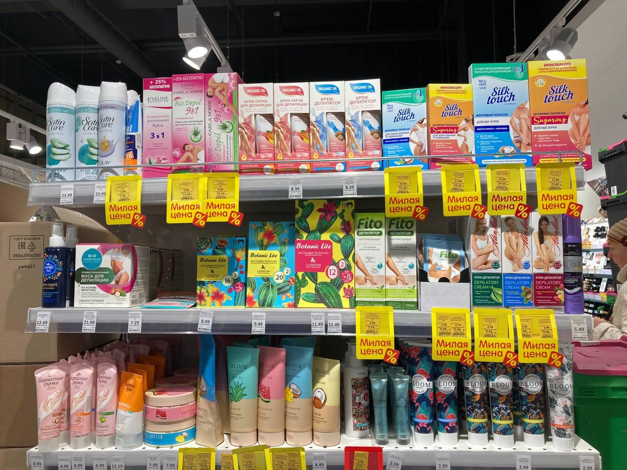 На полках с зубными пастами и жидкостями для мытья посуды плотно, хотя и не очень разнообразно. А вот восковых полосок для эпиляции в магазине не оказалось вообще.