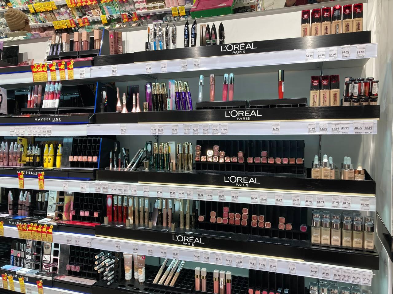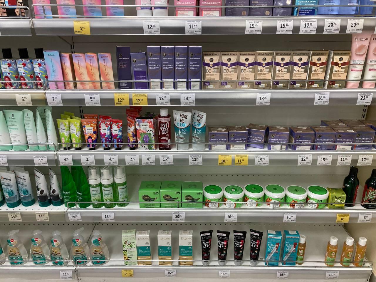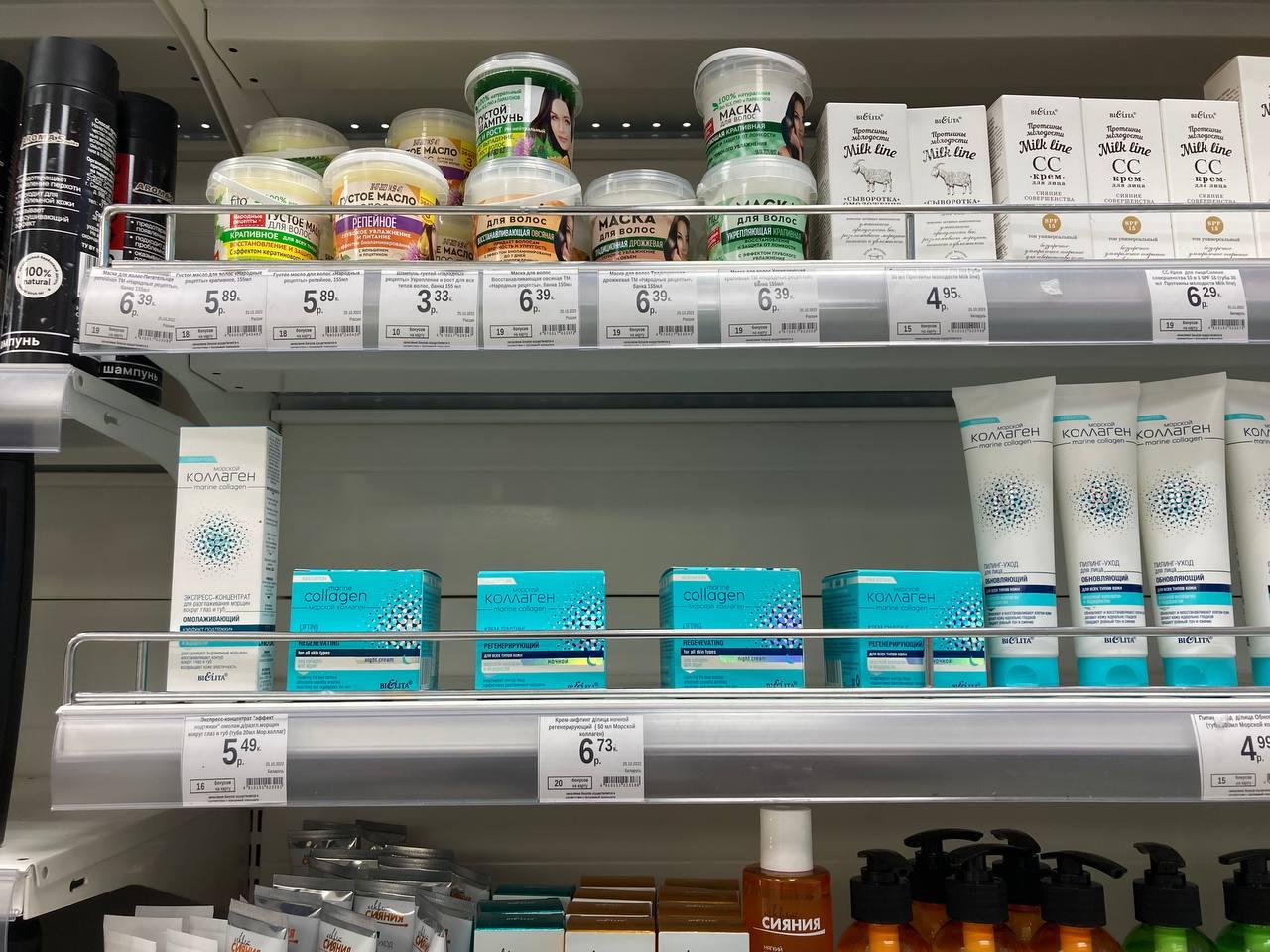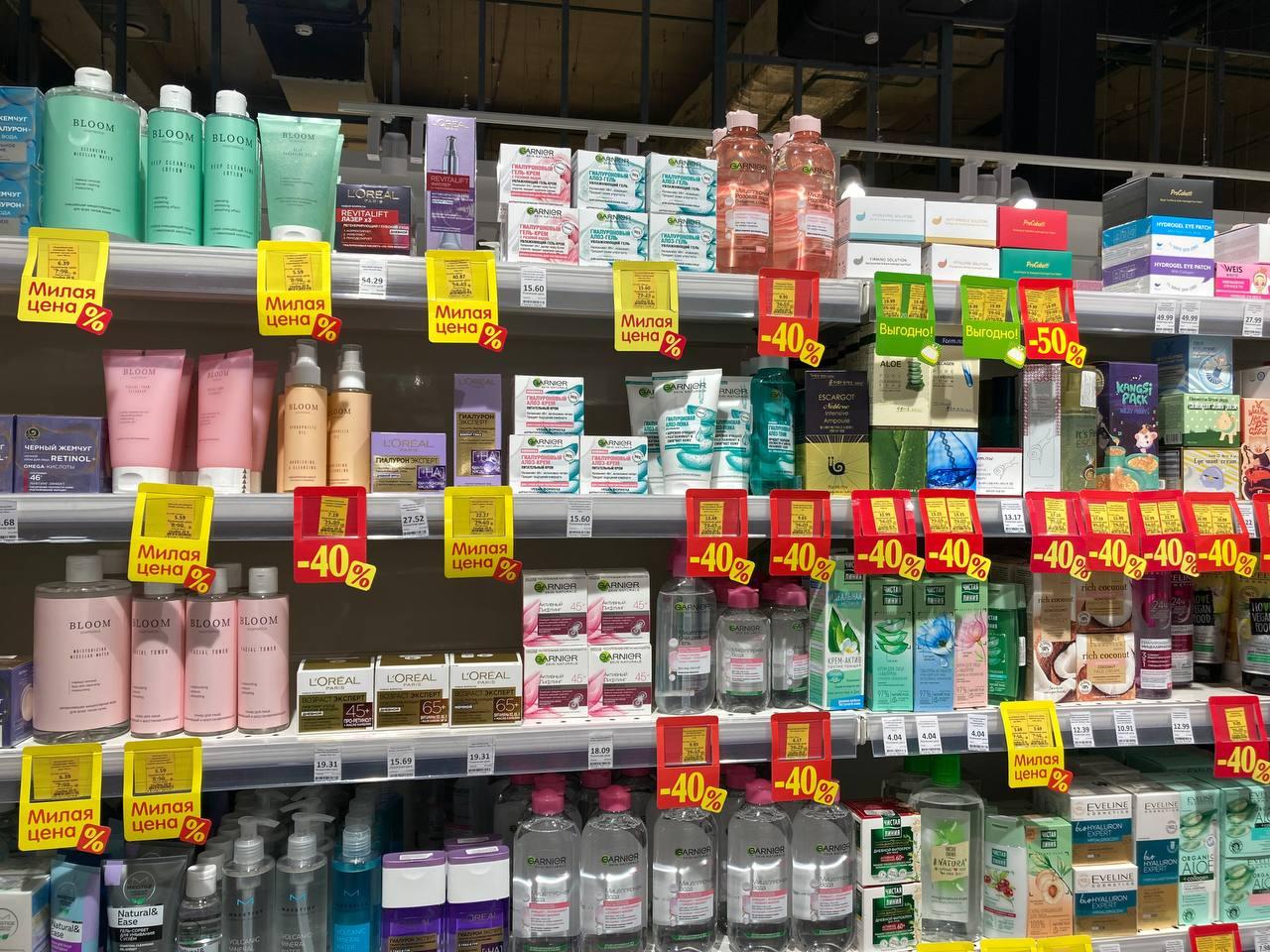 На полках с уходовой косметикой много желтых акционных ценников. Состав брендов по-прежнему широкий: есть и Loreal, и Garnier, и Eveline, и другие марки.