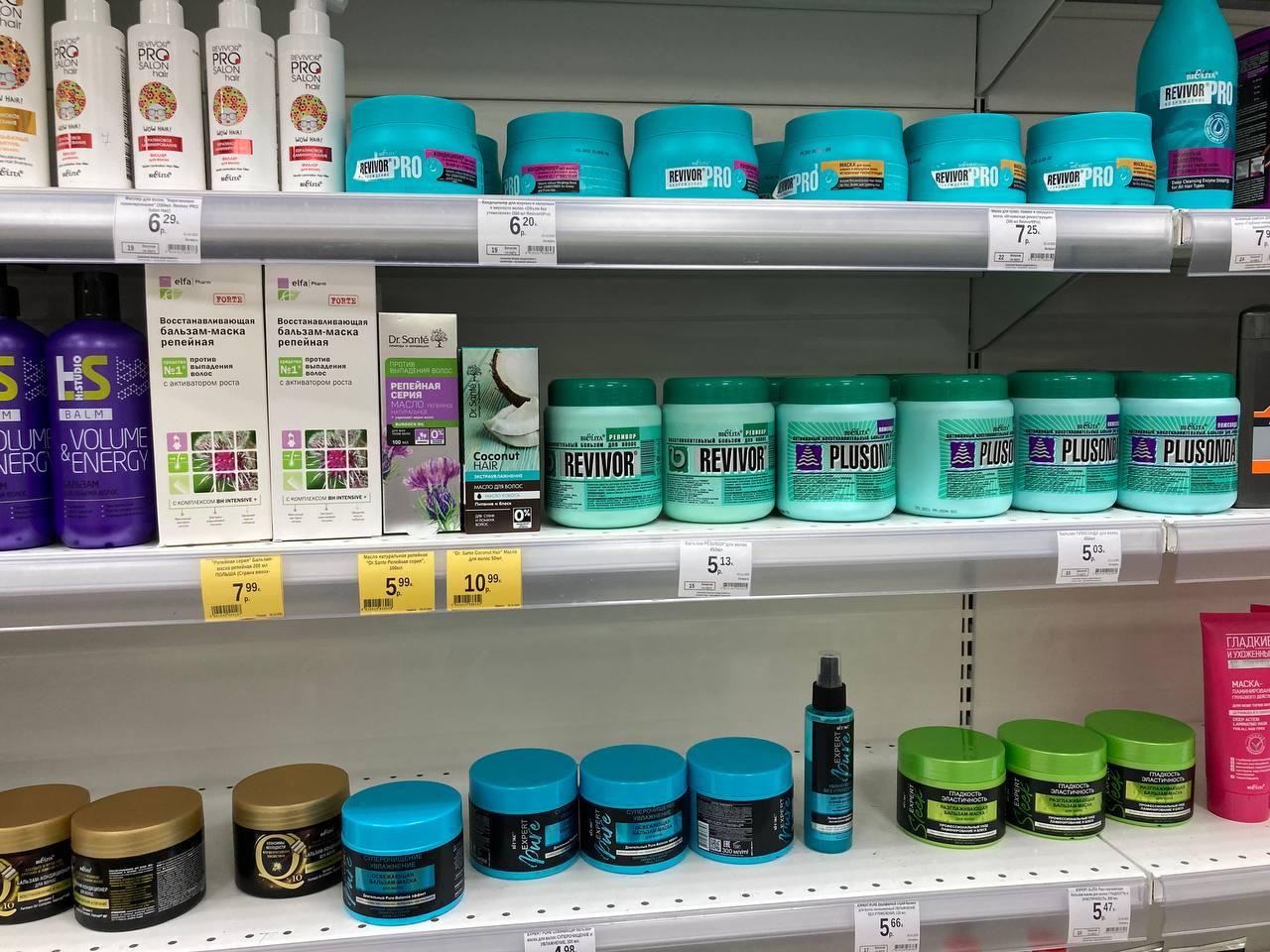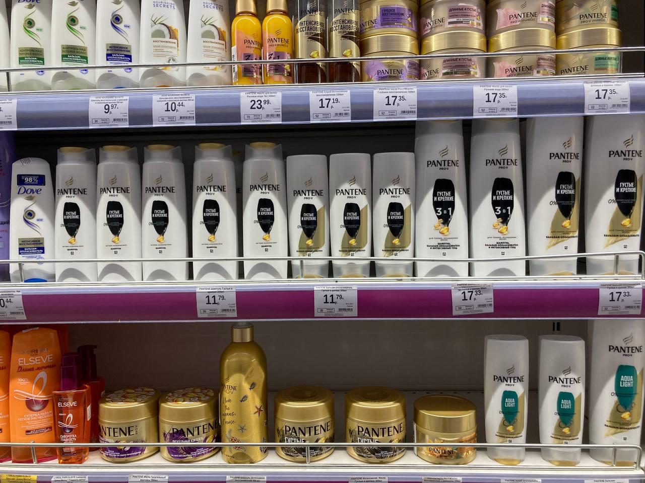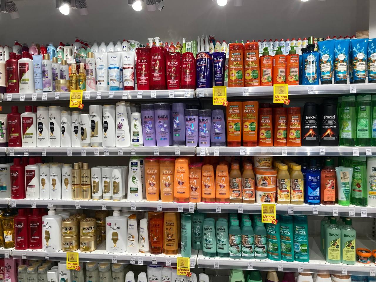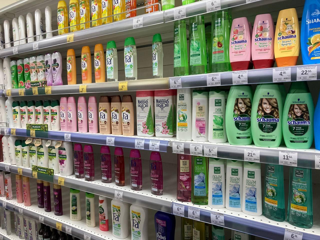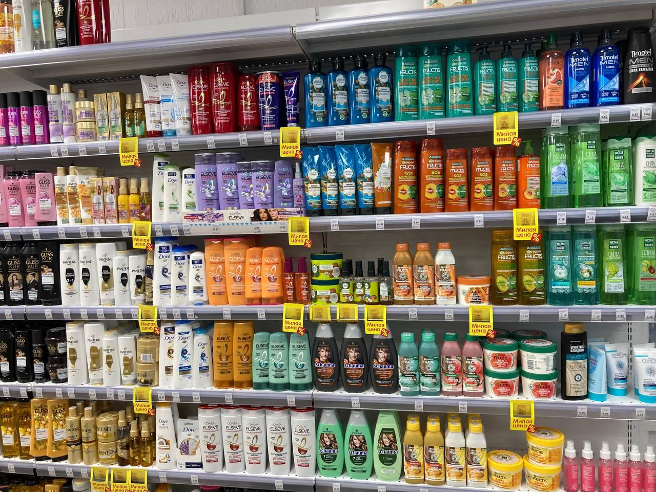 На полках с шампунями в один ряд стоят единичные продукты из разных линеек Loreal, Garnier, Schwarzkopf и других знакомых марок. Что характерно: изобилие белорусских шампуней тоже куда-то подевалось, остались лишь 3–4 наименования.