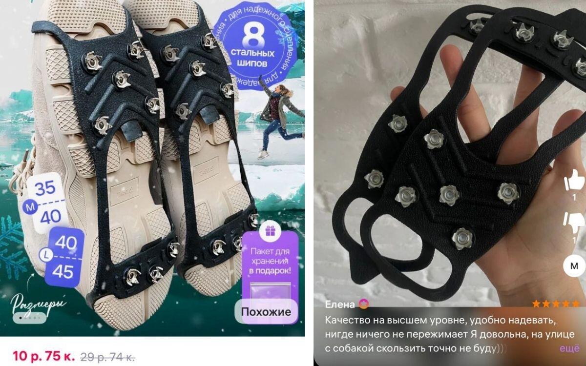 Следующая разработка не нова – ледоступы. Противоскользящие насадки на обувь помогают безопасно передвигаться в гололед. Средняя стоимость товара – 10–15 рублей. Ледоступы представлены в светлом и темном оттенках, чтобы не выделяться на обуви. Выполнены в двух универсальных размерах: М – с 34 по 38 и L – с 39 по 45. Производитель заявляет, что накладка с шипами поможет избежать падения во время пробежек, походов и другого активного отдыха. В числе самых частых замечаний от покупателей – неверный размер и быстрый износ товара.