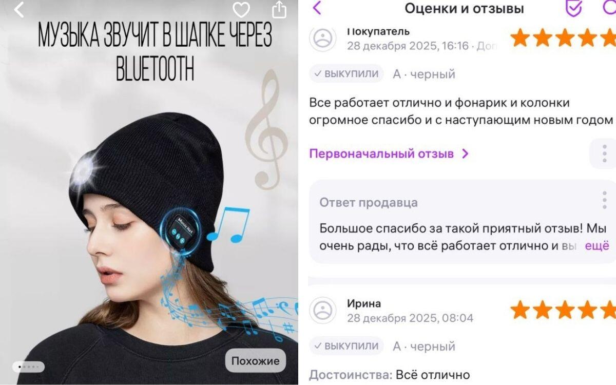 Такой головной убор предназначен для прослушивания музыки и ответа на звонки без использования наушников. Из дополнительных опций – фонарик, который пригодится в темное время суток. Большинство отзывов на музыкальную шапку положительные. Пользователи сообщают, что треки звучат громко, а фонарик удобен во время работы на улице. Товар с рейтингом 4,9 стоит 32,28 рубля.