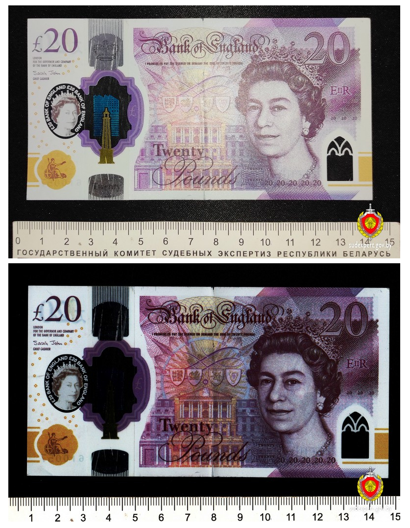 Правоохранители изъяли купюру и направили ее судебным экспертам. Согласно выводам экспертов, билет Банка Англии номиналом 20 фунтов (образца 2018 г.) изготовлен не предприятием, осуществляющим производство продукции данного вида, что подтверждается отсутствием регламентированных элементов защиты: