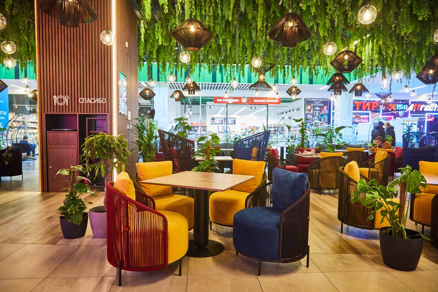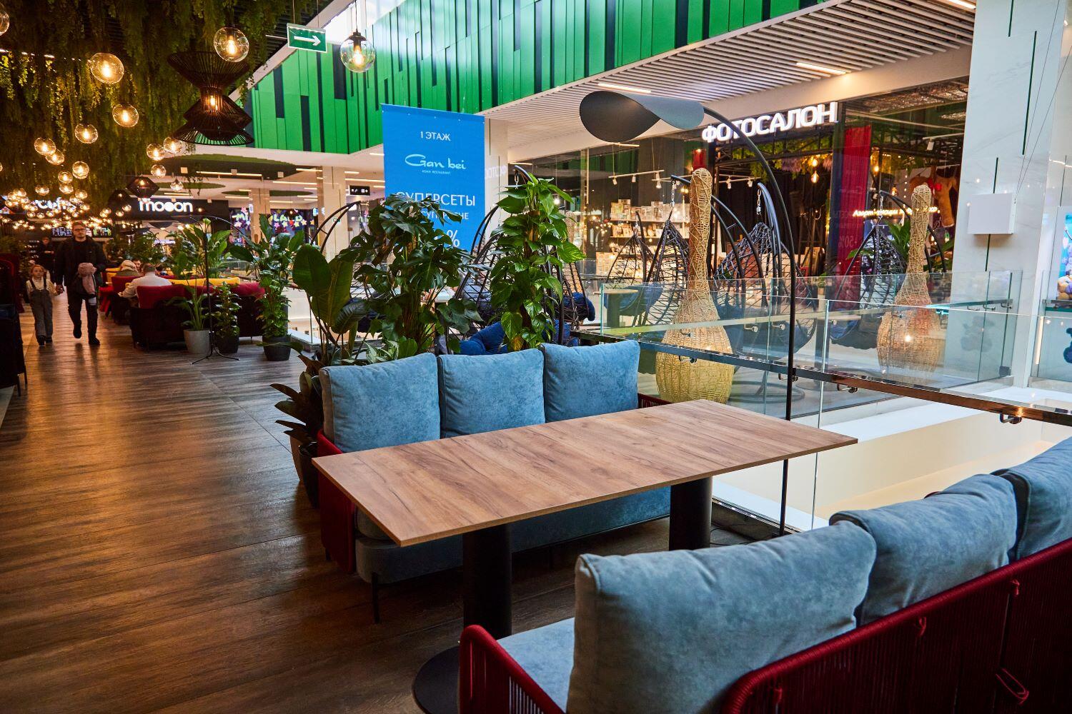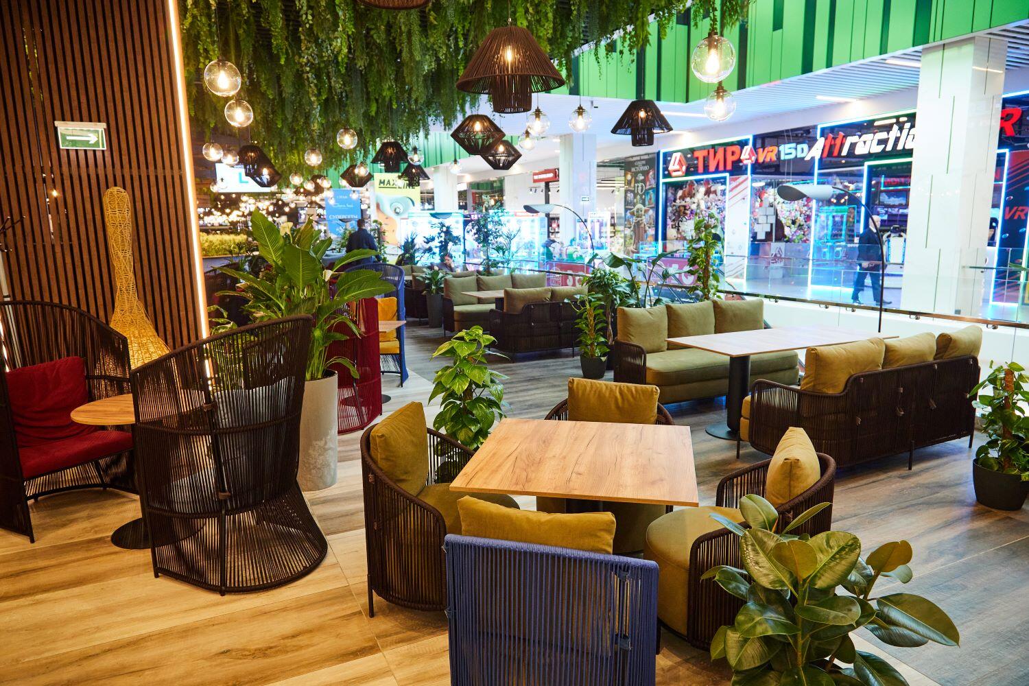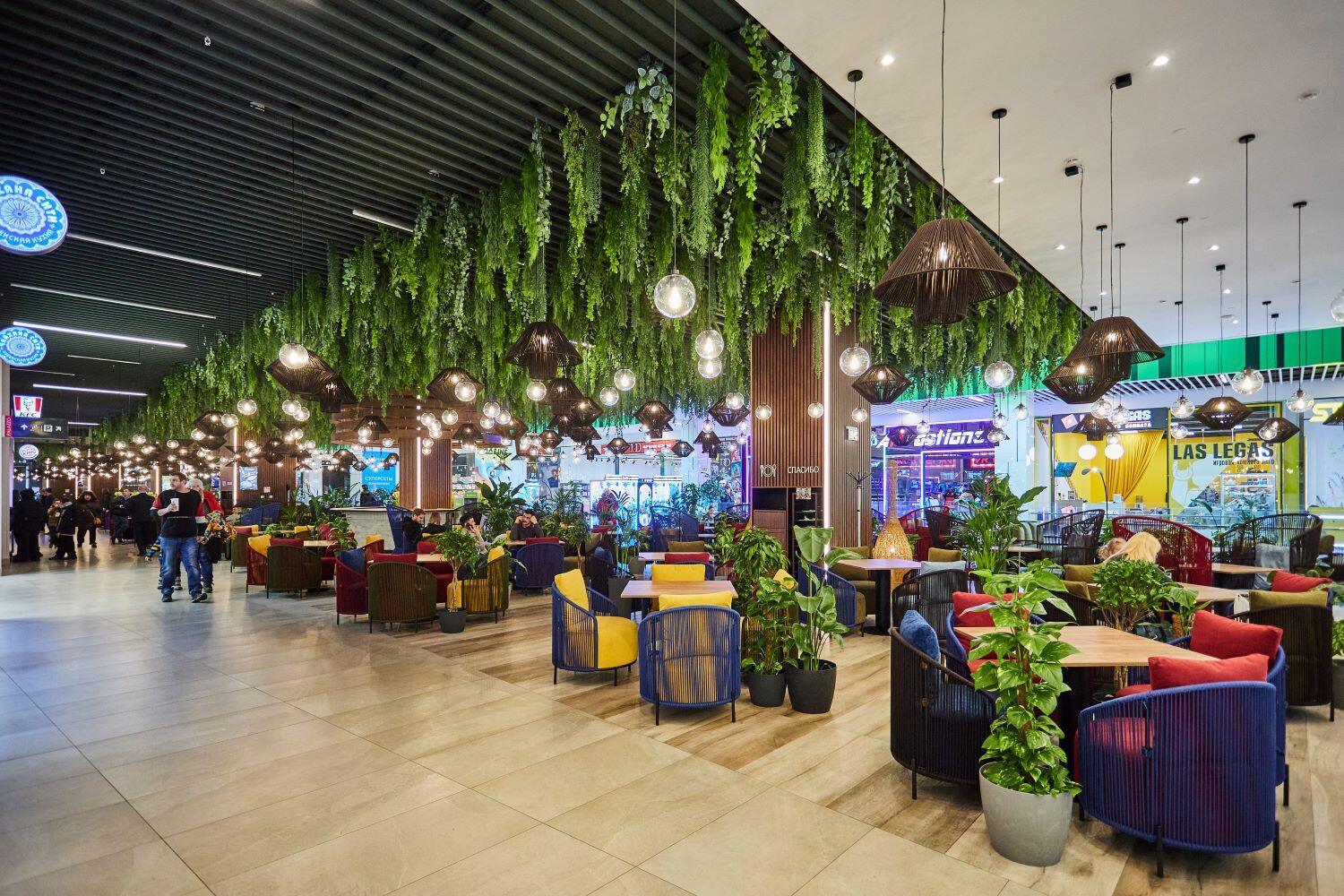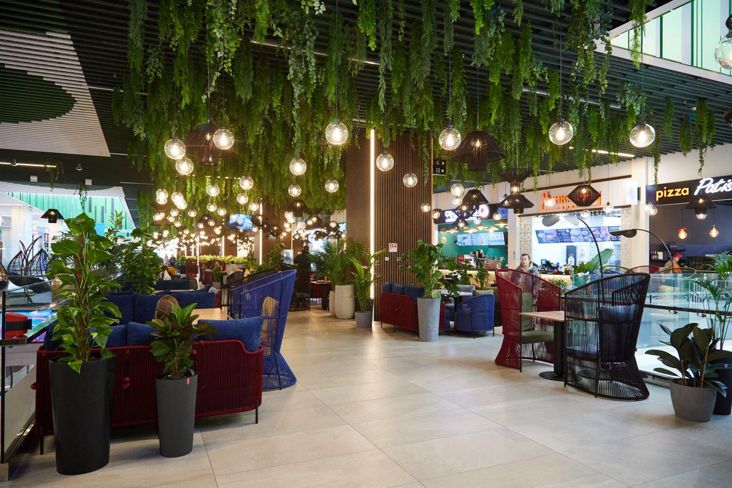 В фудхолл вложили около миллиона долларов. На площади в 1700 «квадратов» разместили ресторанные столики, глубокие диваны и удобные кресла. Под потолком «парят» 286 сферических светильников с подсветкой. А над головой – целый «лес» из искусственной зелени.