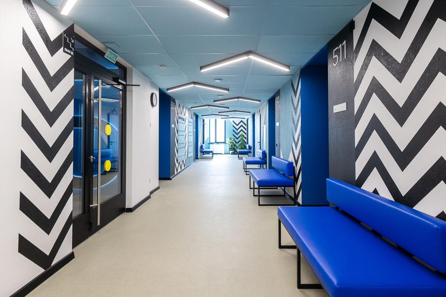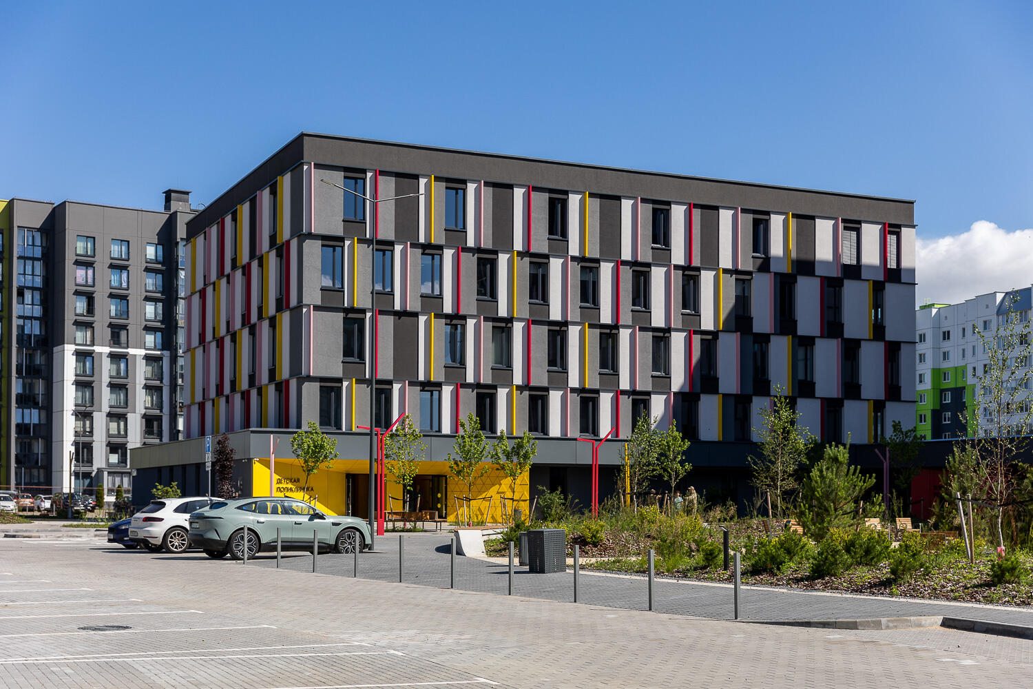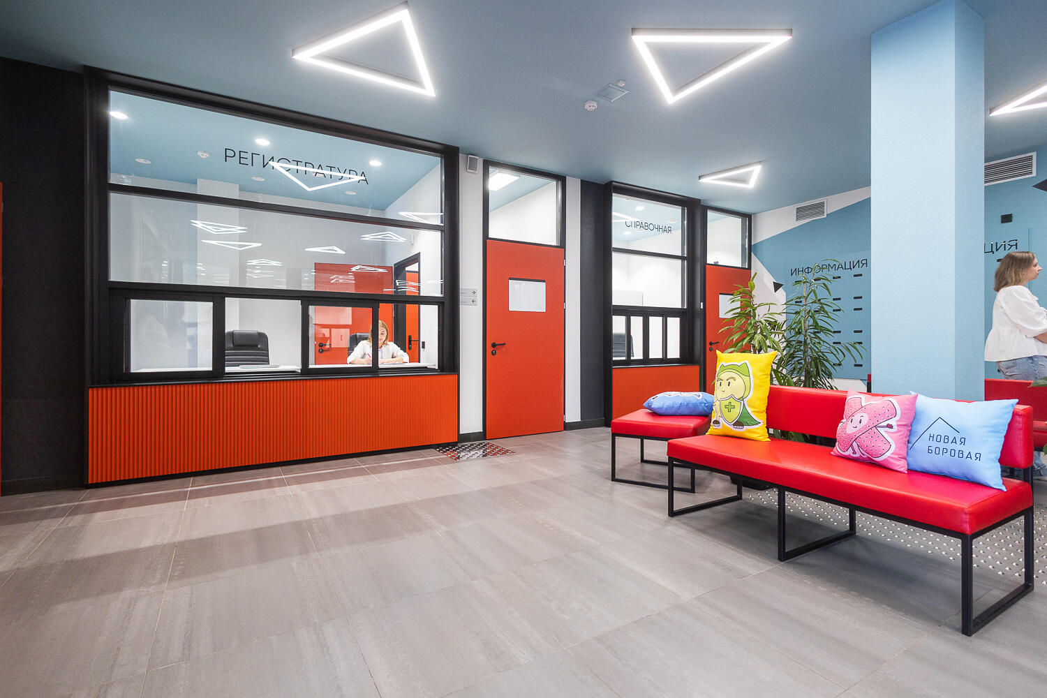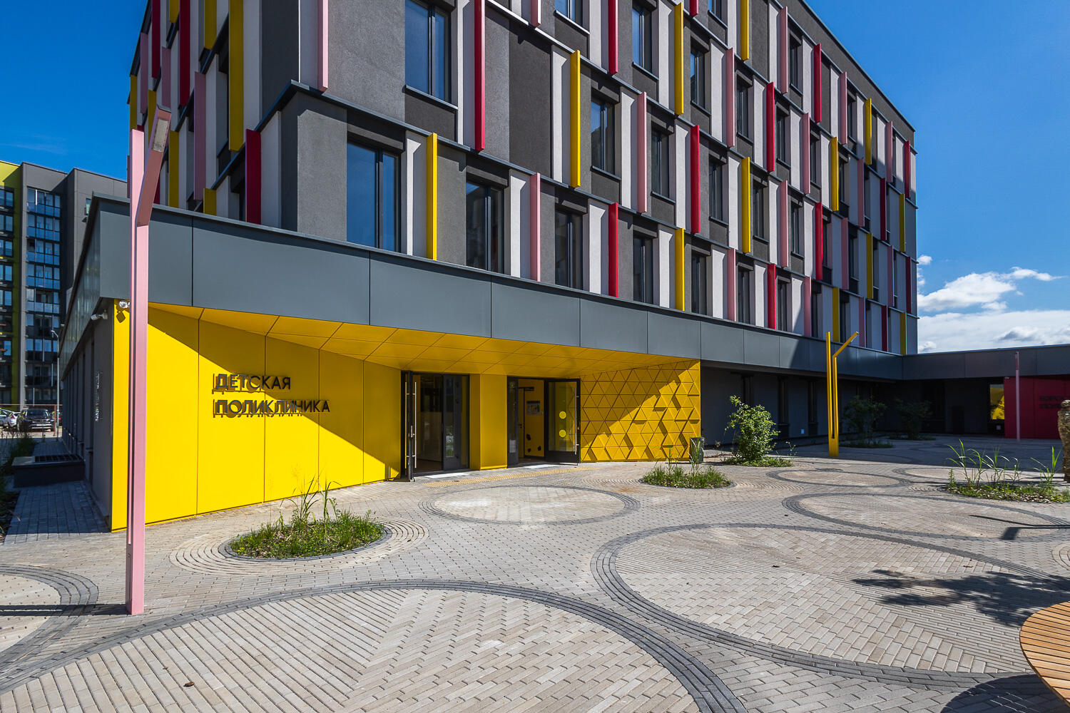 На территории поликлиники есть детская площадка, пешеходные и зеленые зоны, места для отдыха и парковка. Интерьер и фасад выполнены в единой стилистике: каждый этаж имеет свой оттенок с контрастной графикой.