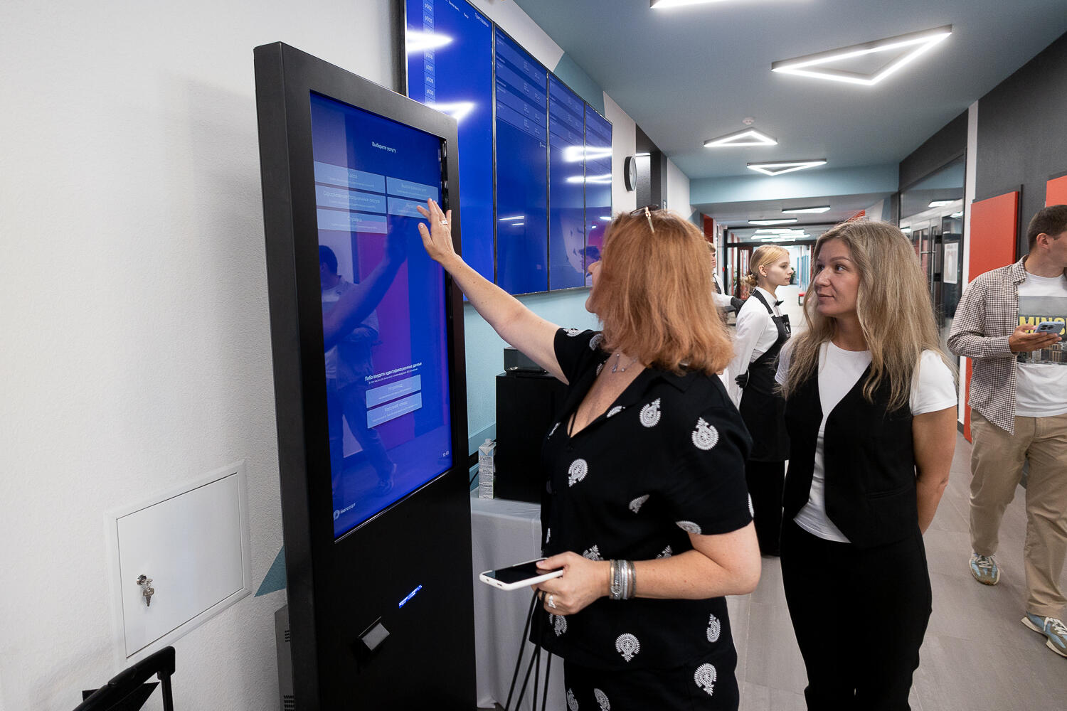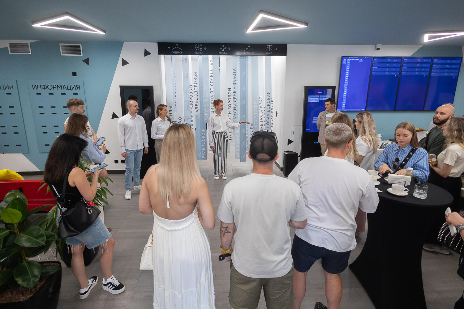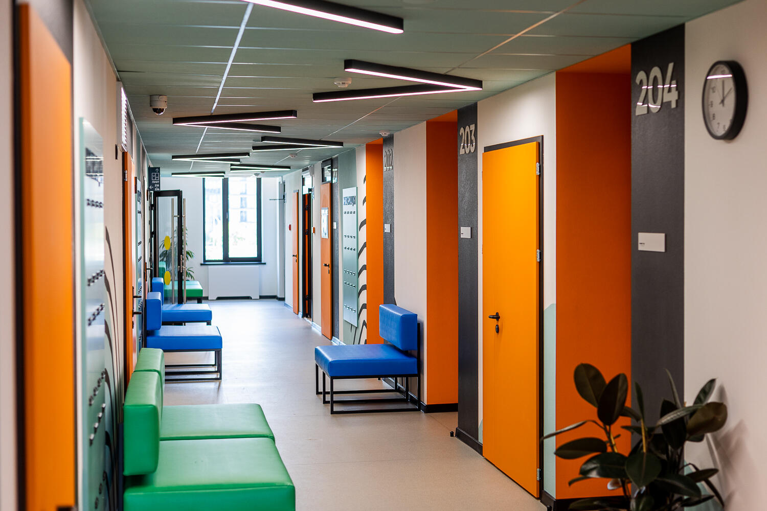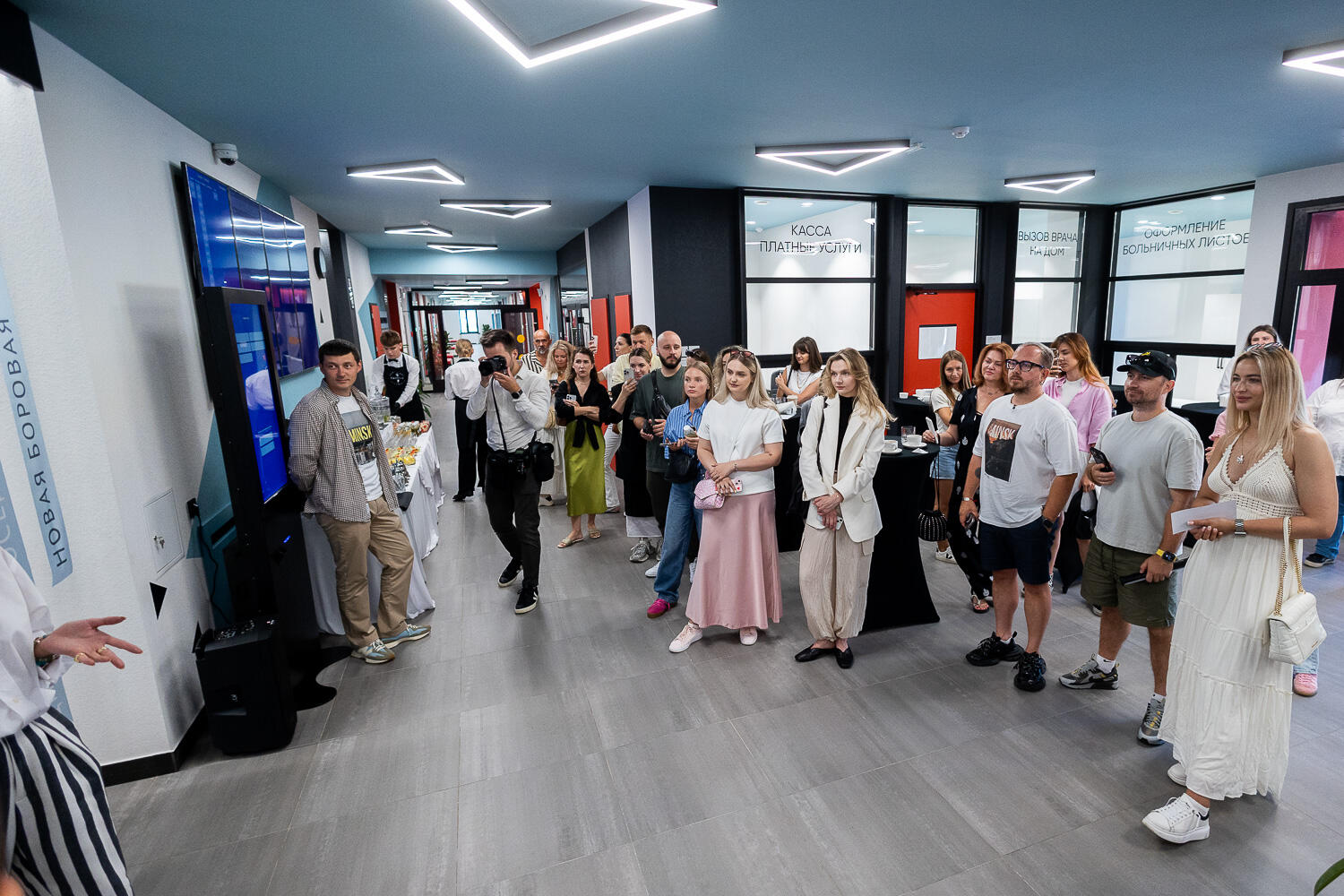На территории поликлиники есть детская площадка, пешеходные и зеленые зоны, места для отдыха и парковка. Интерьер и фасад выполнены в единой стилистике: каждый этаж имеет свой оттенок с контрастной графикой.