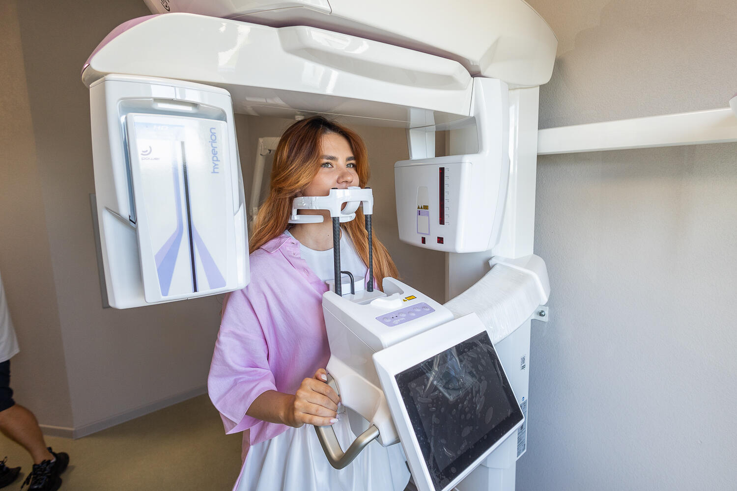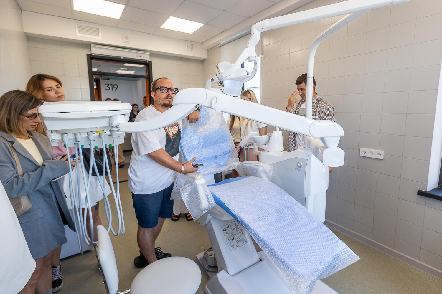 Здесь оборудованы кабинеты узких специалистов, включая три рентген-кабинета общего профиля и отдельные – для детской и взрослой стоматологии. Окна в помещениях с рентген-оборудованием закрыты специальными роллетами для защиты окружающих от излучения.