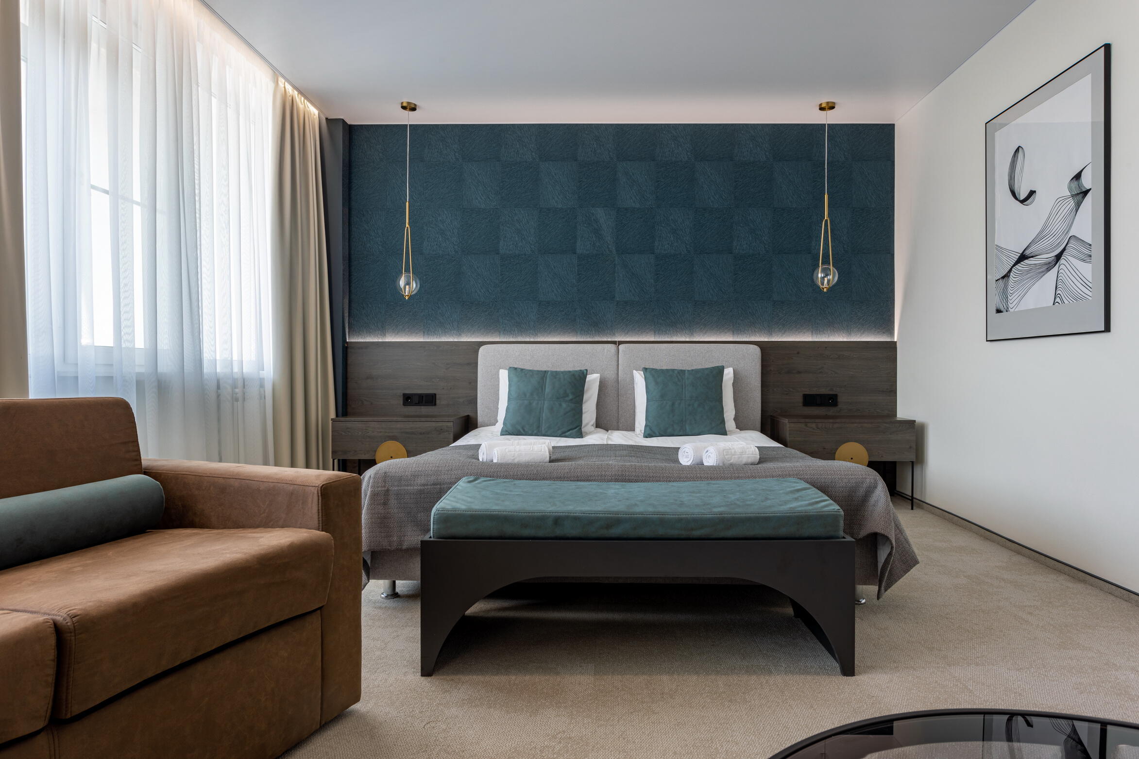 Гостям предлагаются однокомнатные и двухкомнатные номера в различных категориях — от одиночного до люкса.