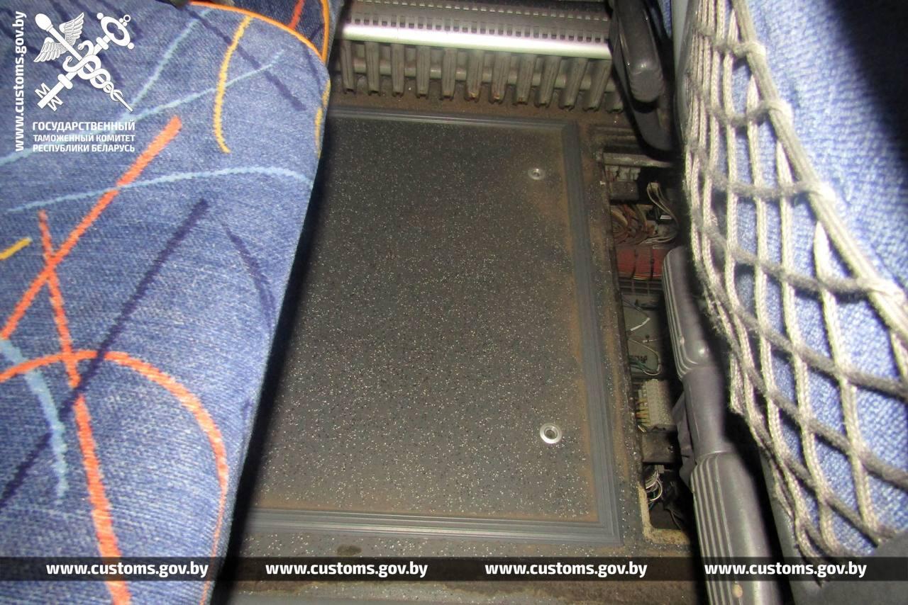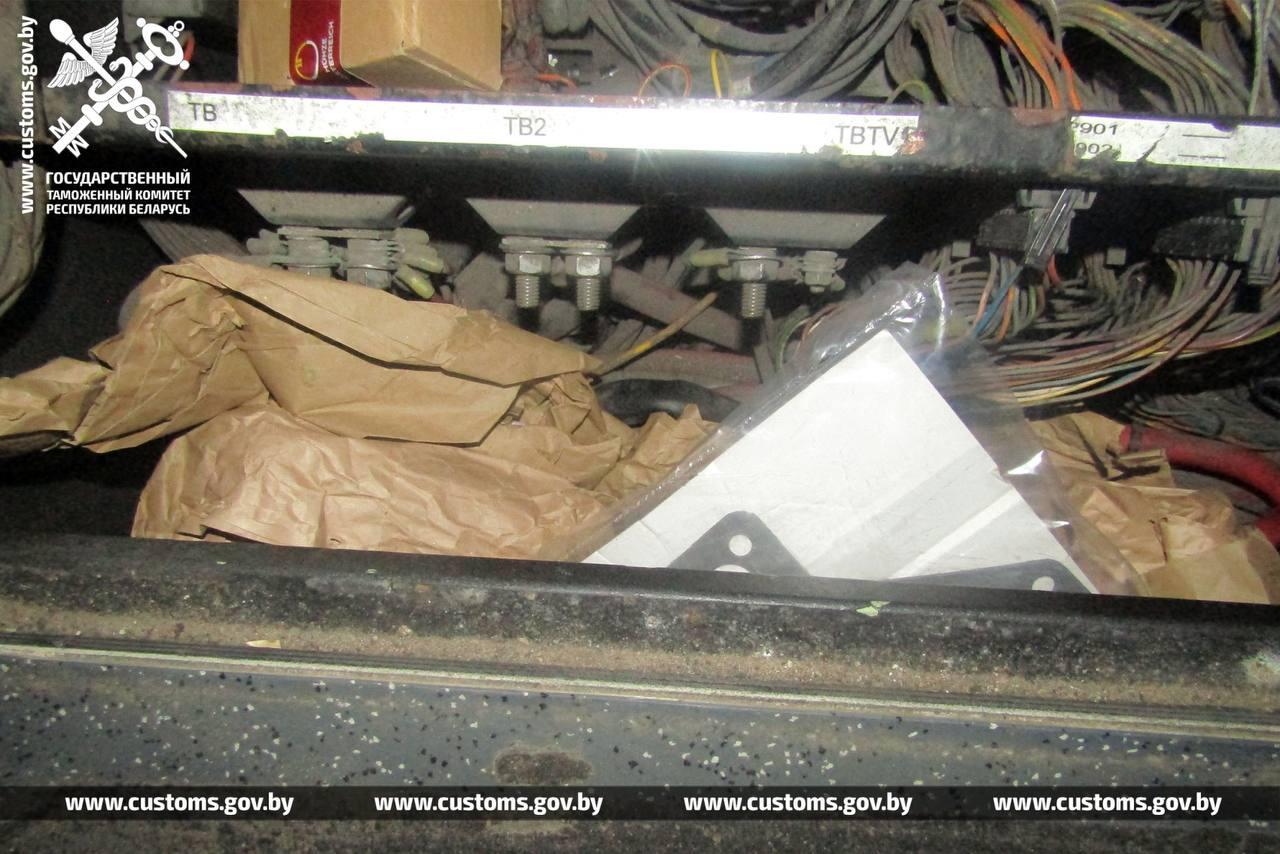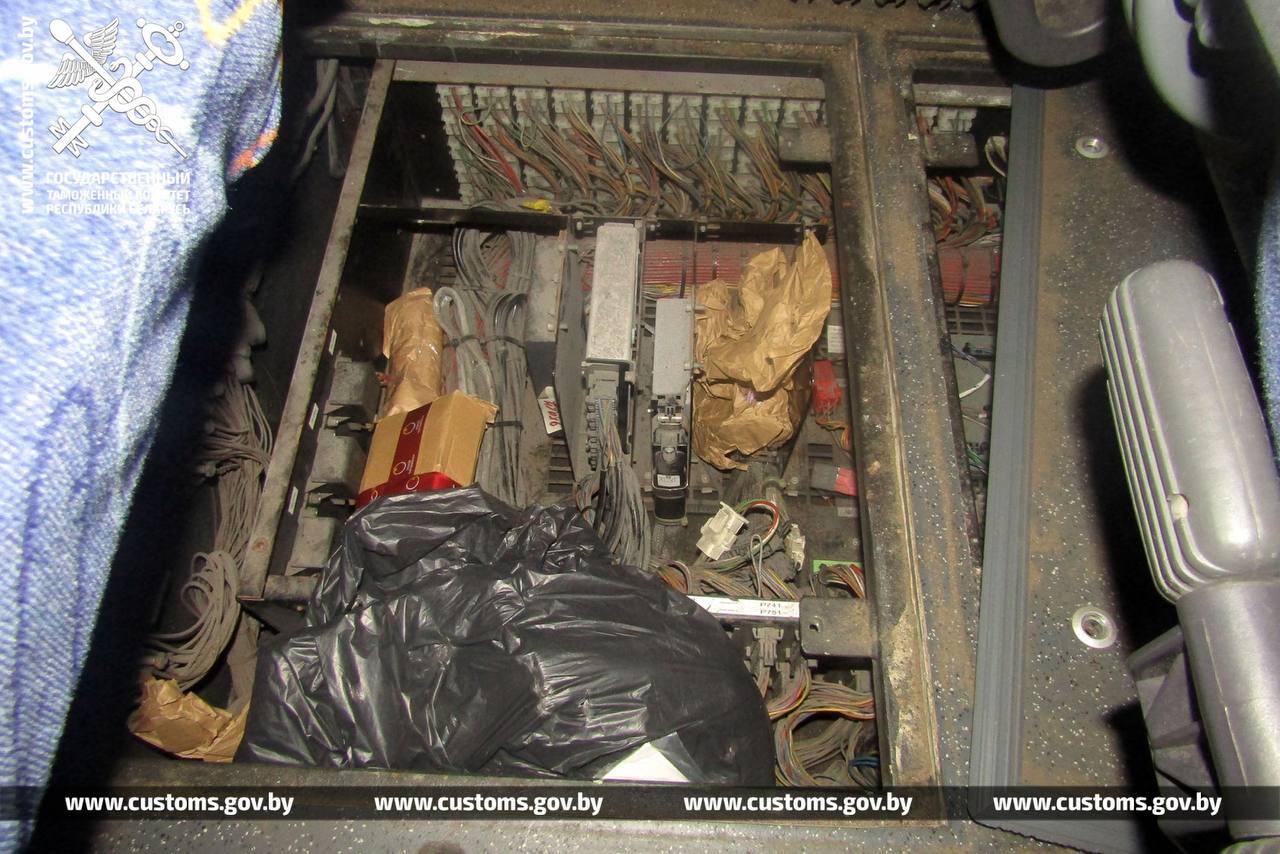 В пресс-службе Гостаможкомитета рассказали, что в ходе проверки автобуса, следовавшего из Литвы, сотрудники таможенной службы обнаружили гидрокостюмы и автозапчасти, спрятанные в люке для проводки предохранителей.