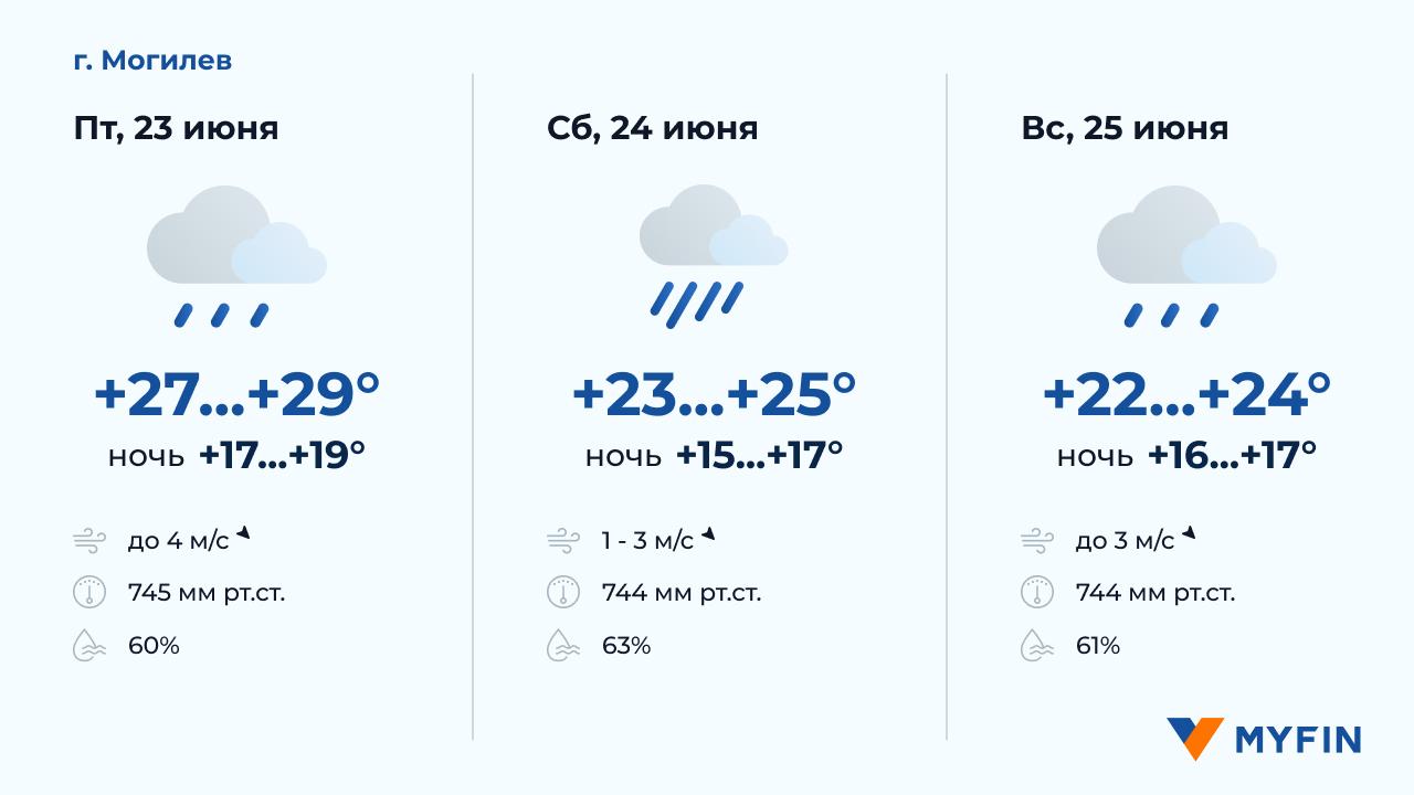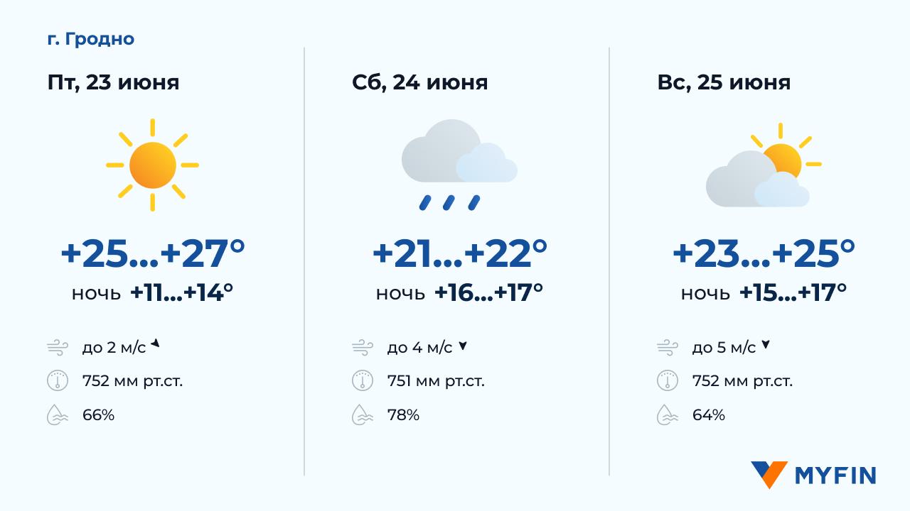 23 июня, в пятницу, ночью, по данным Белгидромета, преимущественно по восточной половине республики, днем в крайних юго-западных районах кратковременные дожди, местами грозы. Ветер западный, северо-западный умеренный, при грозах порывистый. Температура воздуха минимальная ночью +11..+17°С, по юго-востоку +18..+20°С; максимальная днем +24..+30°С.