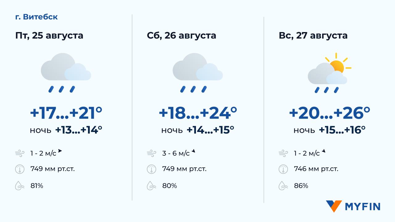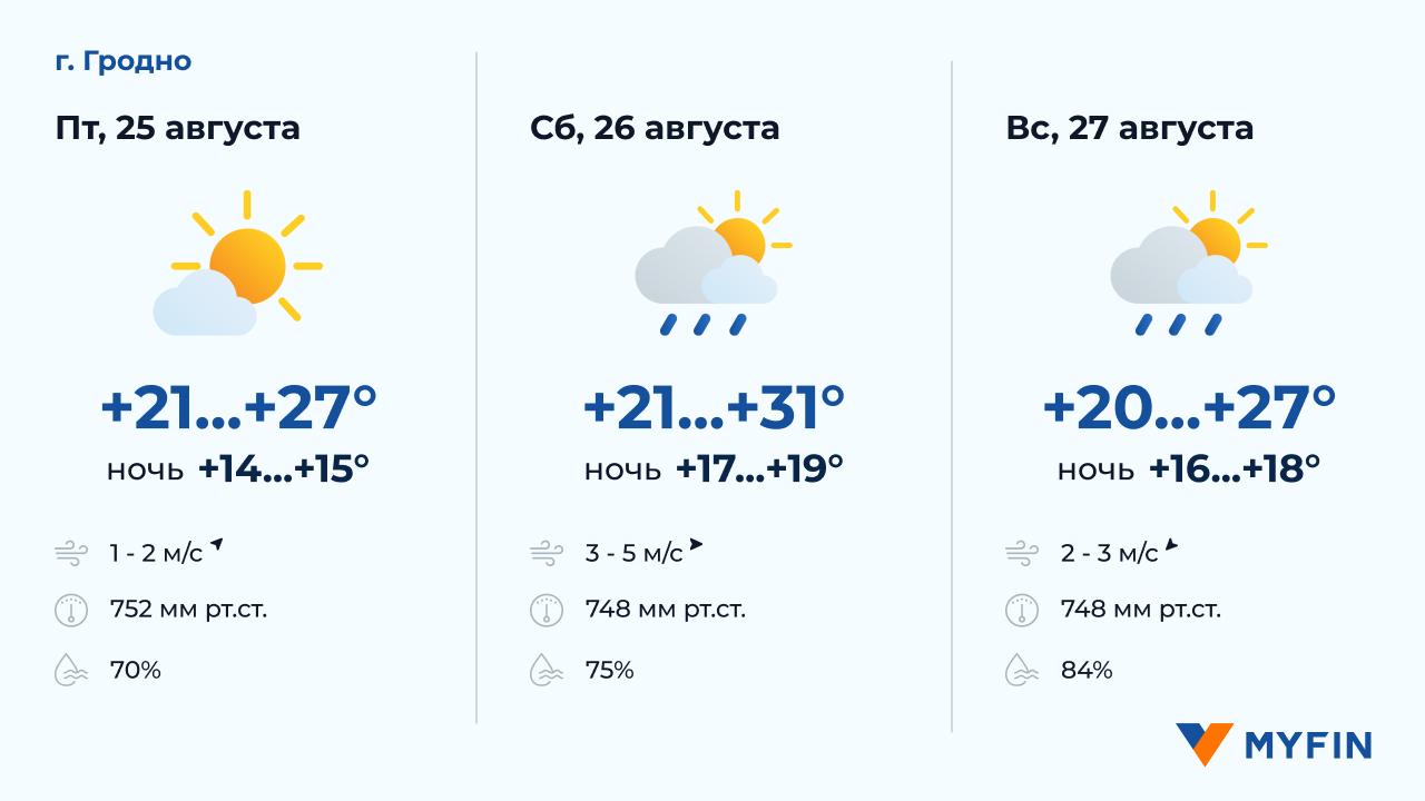 25 августа, по данным Белгидромета, в основном без осадков. Температура воздуха днем около +19..+24°С. Ветер западный, скоростью 1-3 м/c. 26 августа возможны осадки. Температура воздуха ночью +15..+16°С, днем +18..+22°С. Ветер южный, скоростью 3-5 м/c. 27 августа возможны дожди. Температура воздуха ночью +16..+17°С, днем +22..+27°С. Ветер северный, скоростью 2-3 м/c.