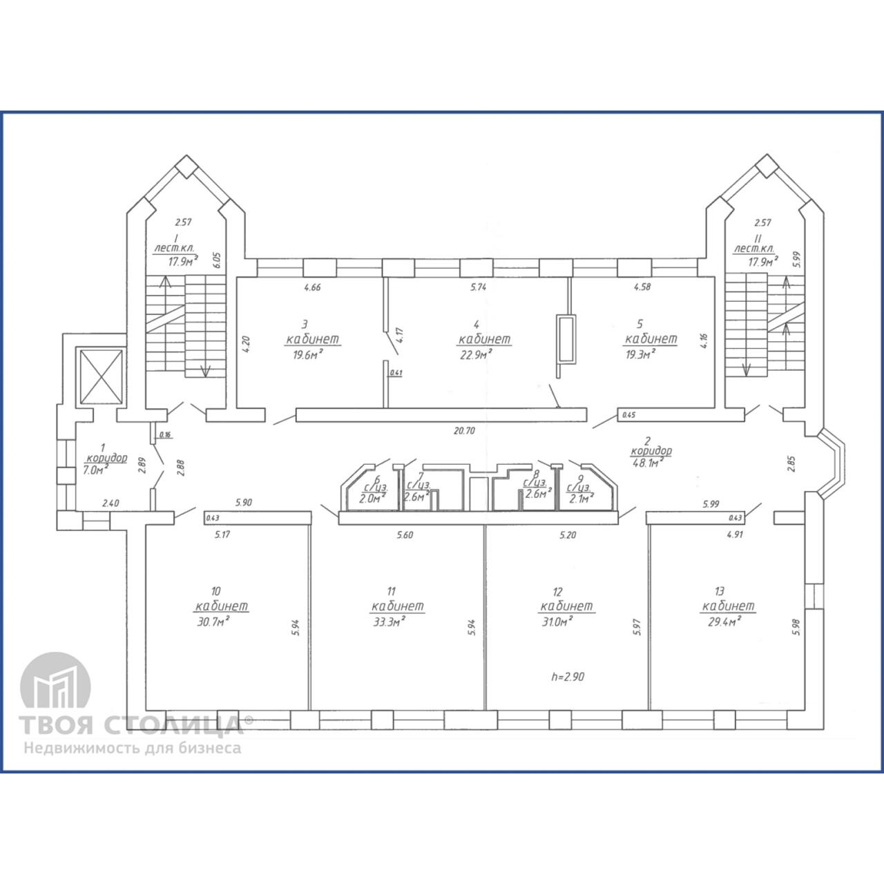 Предложенный офисный блок на 4 этаже, площадью 250.6 кв.м, представлен кабинетной системой с 2-мя с/у.