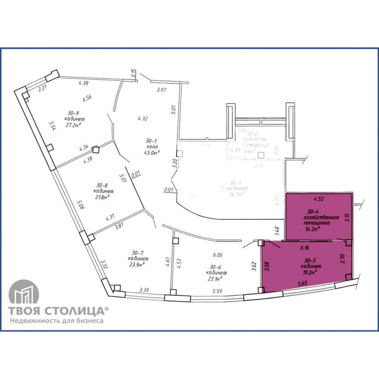 Административные помещения общей площадью 33.4 кв.м. Представлено 2 кабинетами, площадью 19.2 и 14.2 кв.м. ( №30-4 и 30-5) Располагается на 3 этаже административного здания. Высокие потолки (h=3.00 метра), естественное освещение, заведены коммуникации: