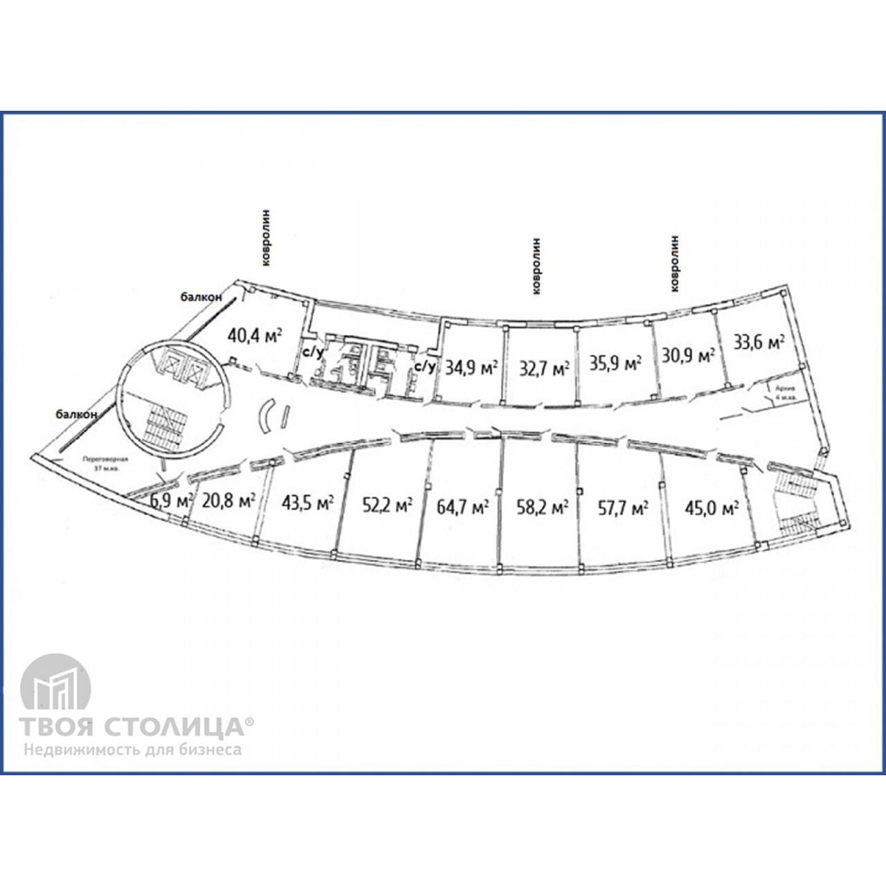 Этаж состоит из: 14 кабинетов, ресепшена, серверной комнаты с двумя кондиционерами, переговорной, мини-кухни около 35 кв.м, двух просторных c/у, кладовой (душевой), архивной для документов, гардероба и трех балконов, не включенных в арендуемую площадь.