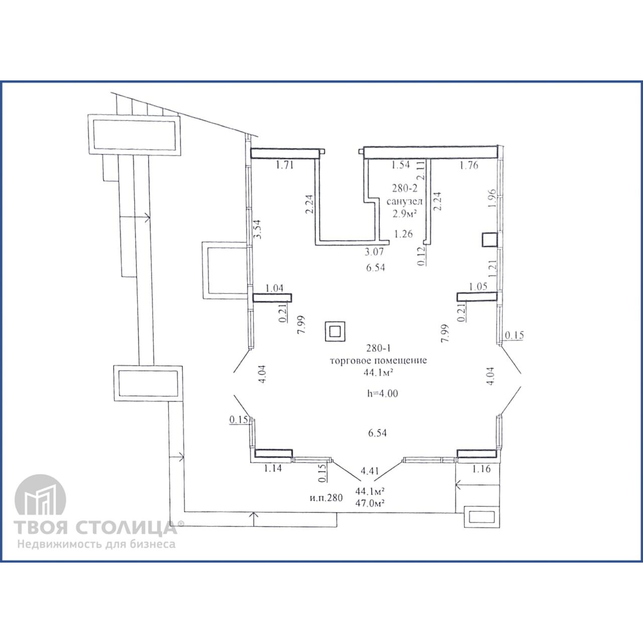 Помещение с высокой инсоляцией без отделки включает в себя торговый зал общей площадью 44,1 кв.м., санузел. Функционирует центральное отопление, пожарная сигнализация, высокоскоростной интернет. Подведено электричество, вода, канализация.