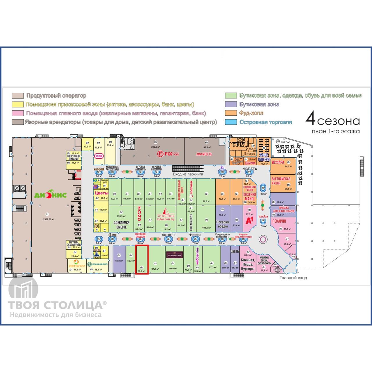 Торговое помещение площадью 57.8 кв.м. в торговом центре "4 СЕЗОНА" , расположенном на пересечении улиц Скрипникова и Вышелесского, в нескольких минутах ходьбы от ул. Притыцкого, рядом остановка общественного транспорта, близость к спальным районам «Красный Бор» и «Сухарево».Помещение расположено близко к продуктовому гипермаркету "Дионис".С базовой отделкой. Возможна адаптация торгового помещения для бизнесаКоммуникации:- приточно-вытяжная вентиляция;- установлен счетчик на электроэнергию;- есть возможность подвода воды/ канализации.Общая площадь торгового комплекса составляет 16 000 кв.м. Якорным продуктовым оператором является гипермаркет Дионис площадью 2300 кв.м.В окружении расположены остановки общественного транспорта, вместительная парковка рядом с ТЦ и крытый паркинг на 300 машиноместАрендатор не оплачивает услуги агентства.Юридический адрес: Минск, пр. Независимости, д. 68, пом. 2, ком. 131
