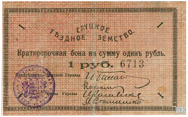 В исторических источниках встречается упоминание о так называемом, «рубле БНР». Тут имеется в виду «краткосрочная бонна на сумму 1 рубль», которую выпустило Слуцкое уездное земство в 1918 году.