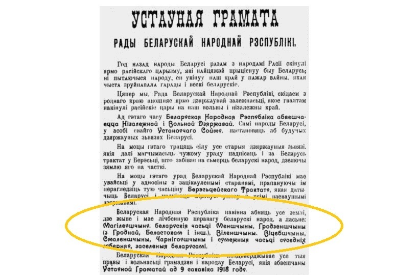 «Беларуская Народная Рэспубліка павінна абняць усе землі, дзе жыве і мае лічбенную перавагу беларускі народ, а ласьне: Магілеўшчыну, беларускія часьці Меншчыны, Гродзеншчыны (з Гроднай, беластокам і інш.), Віленшчыны. Віцебшчыны, смаленшчыны, Чарнігаўшчыны і сумежныя часьці суседніх губерняў, заселеныя беларусамі».