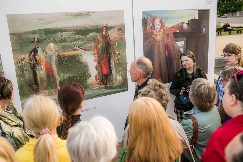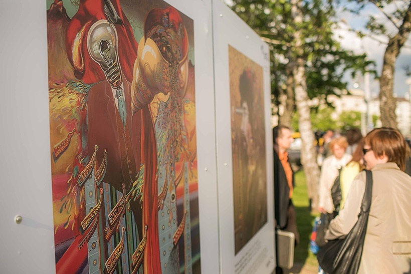 В четверг площадь Якуба Коласа была наполнена сюрреалистической атмосферой. Театральное представление, музыка и картины под открытым небом погрузили жителей и гостей города в яркое и красочное путешествие по творчеству «белорусского Сальвадора Дали». Гости выставки также смогли наблюдать театральный перфоманс с ожившими героями картин Георгия Скрипниченко.