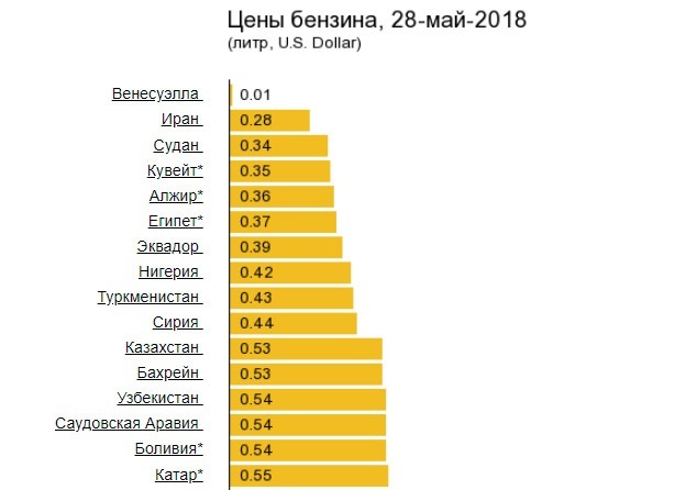 Согласно данным ресурса GlobalPetrolPrices.com, в среднем литр бензина в мире сегодня стоит 1,16 долларов. В разных странах цены на автомобильное топливо отличаются.