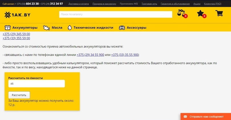 Чтобы воспользоваться услугами первой, нужно отвезти аккумулятор в единственный пункт приема по адресу: Минская область, Минский район, Новодворский сельсовет, 42/2, район агрогородка Гатово. Получить деньги можно как в зависимости от его массы, так и его емкости. Согласно расчетному калькулятору на сайте организации, ориентировочная выгода может составить: